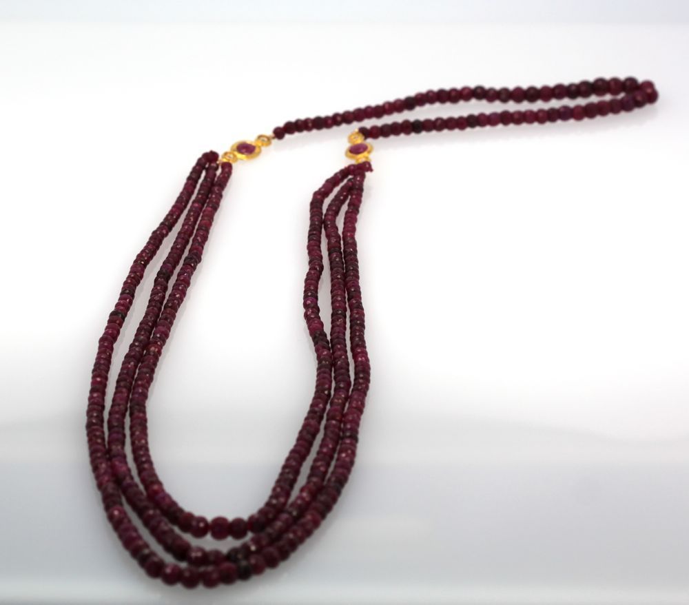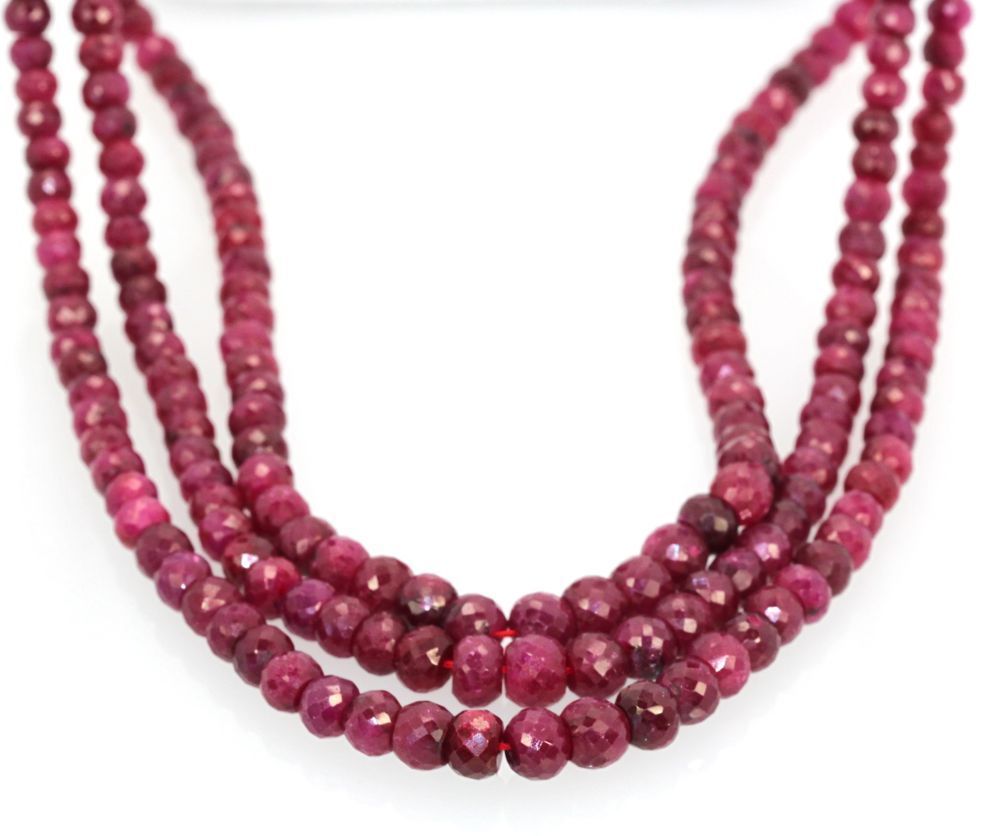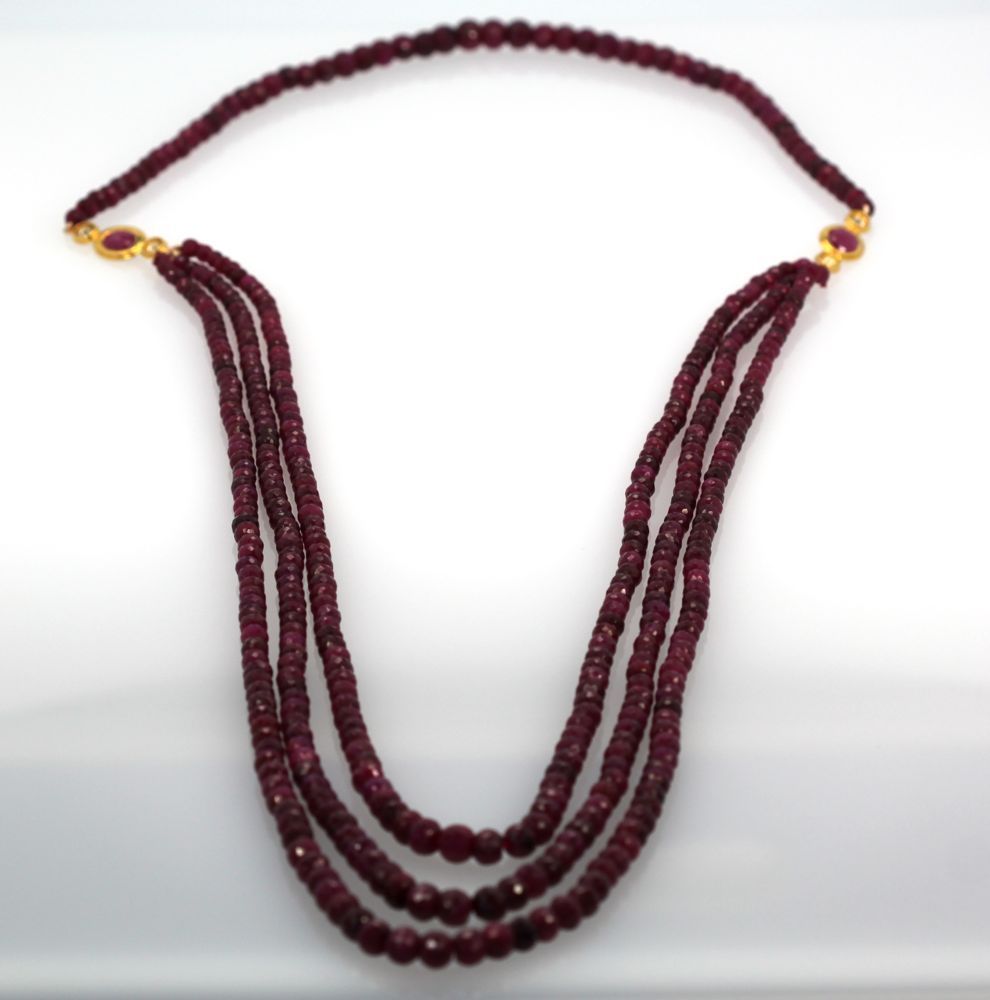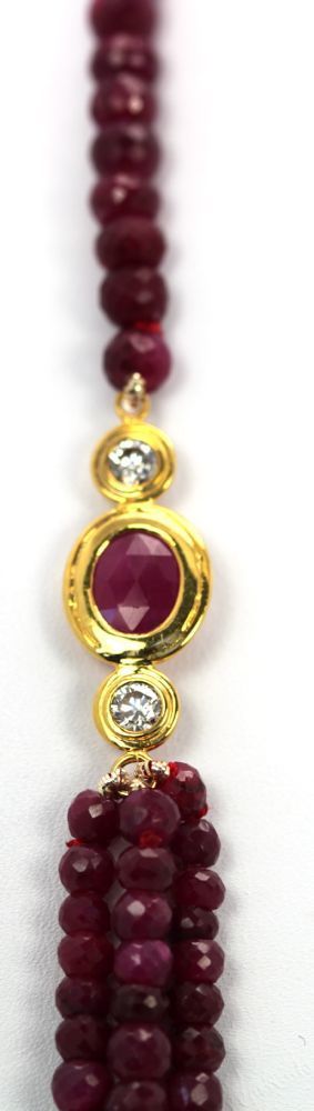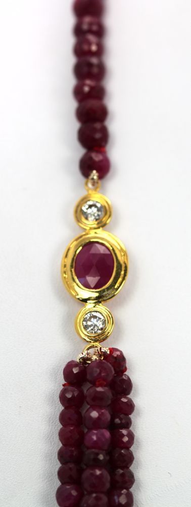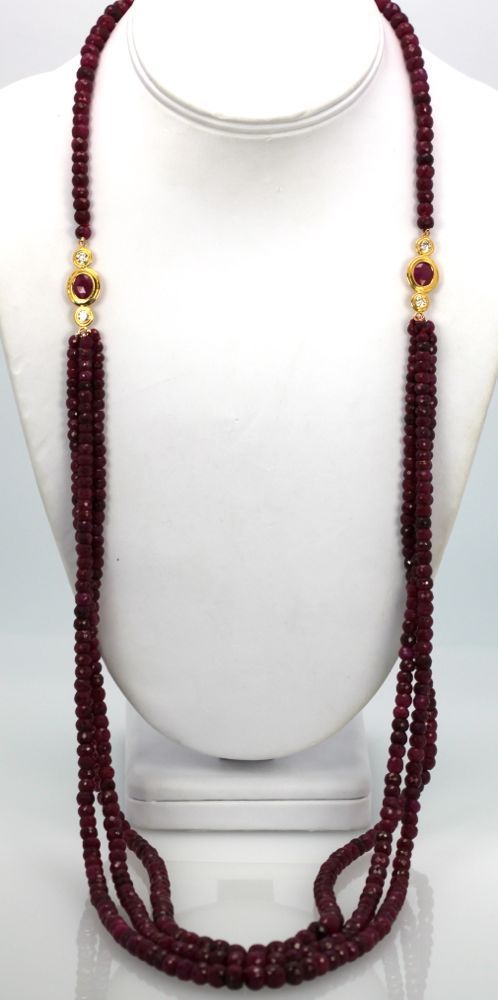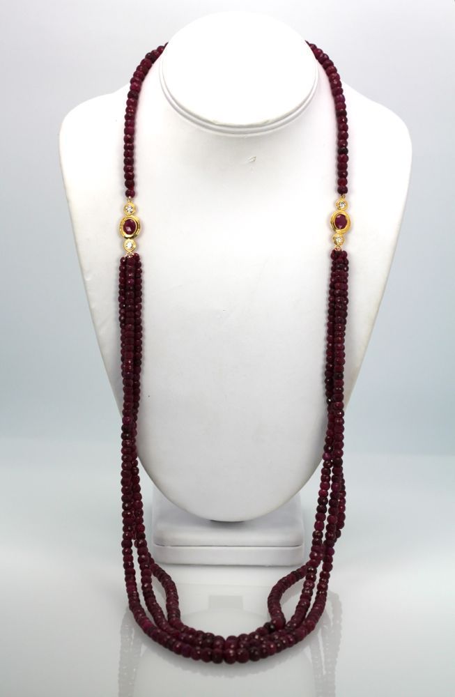 Triple Strand Ruby Bead Necklace With Diamonds