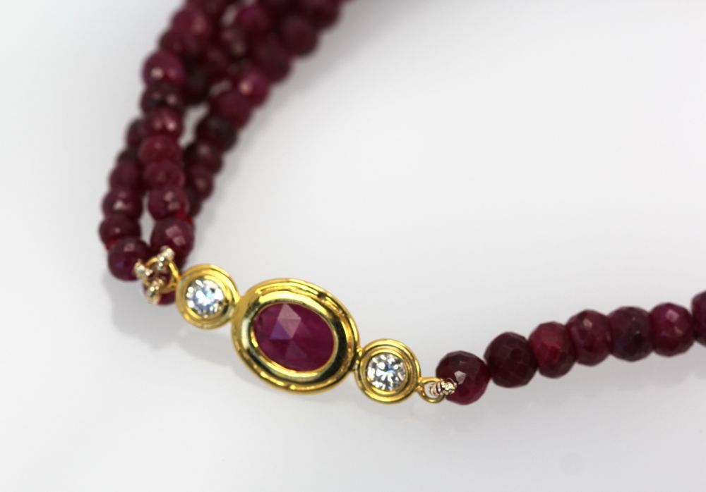 The two faceted oval rubies are approximately 1.50 carats each. Also, there are four .20 diamond stations separate the three strands from the one strand. In addition, the necklace is a long 36″ and really is beautiful.