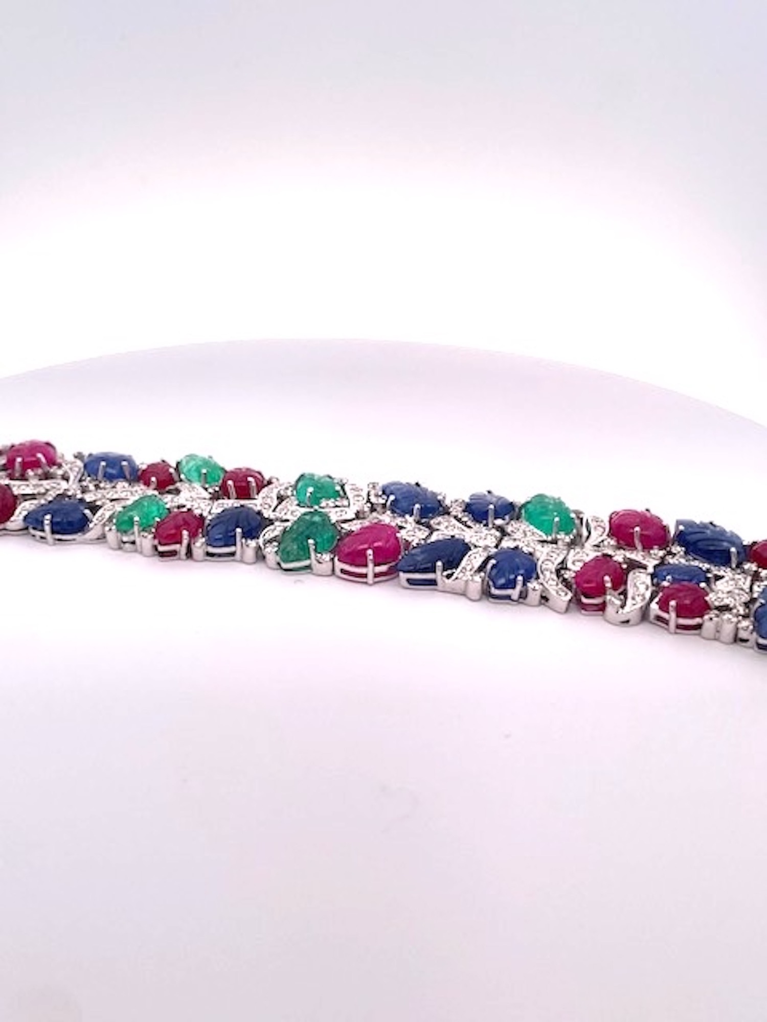 This Tutti Frutti Bracelet has all the bells and whistles it is gorgeous and amazing. This bracelet weighs over 82.3 grams is 18K gold made in Italy. This bracelet is 7.5 inches long and 1" wide and holds 9 Emeralds, 13 Sapphires, 16 Rubies all within a full cut Diamond center. As for carat weight I can not give that to you but suffice to say a minimum of 38 carats of gemstones. As for Diamonds they are very white and bright so I would estimate the Diamonds are G in color, and clarity VVS2. Tutti Frutti bracelets are rare, many people list items s Tutti Frutti but unless the gemstones are carved leaves in Emerald, Sapphire and Ruby they are not Tutti Frutti so be aware. Also the very best Tutti frutti has round cabochon stones such as Rubies for the berries throughout the bracelet. This bracelet is special.