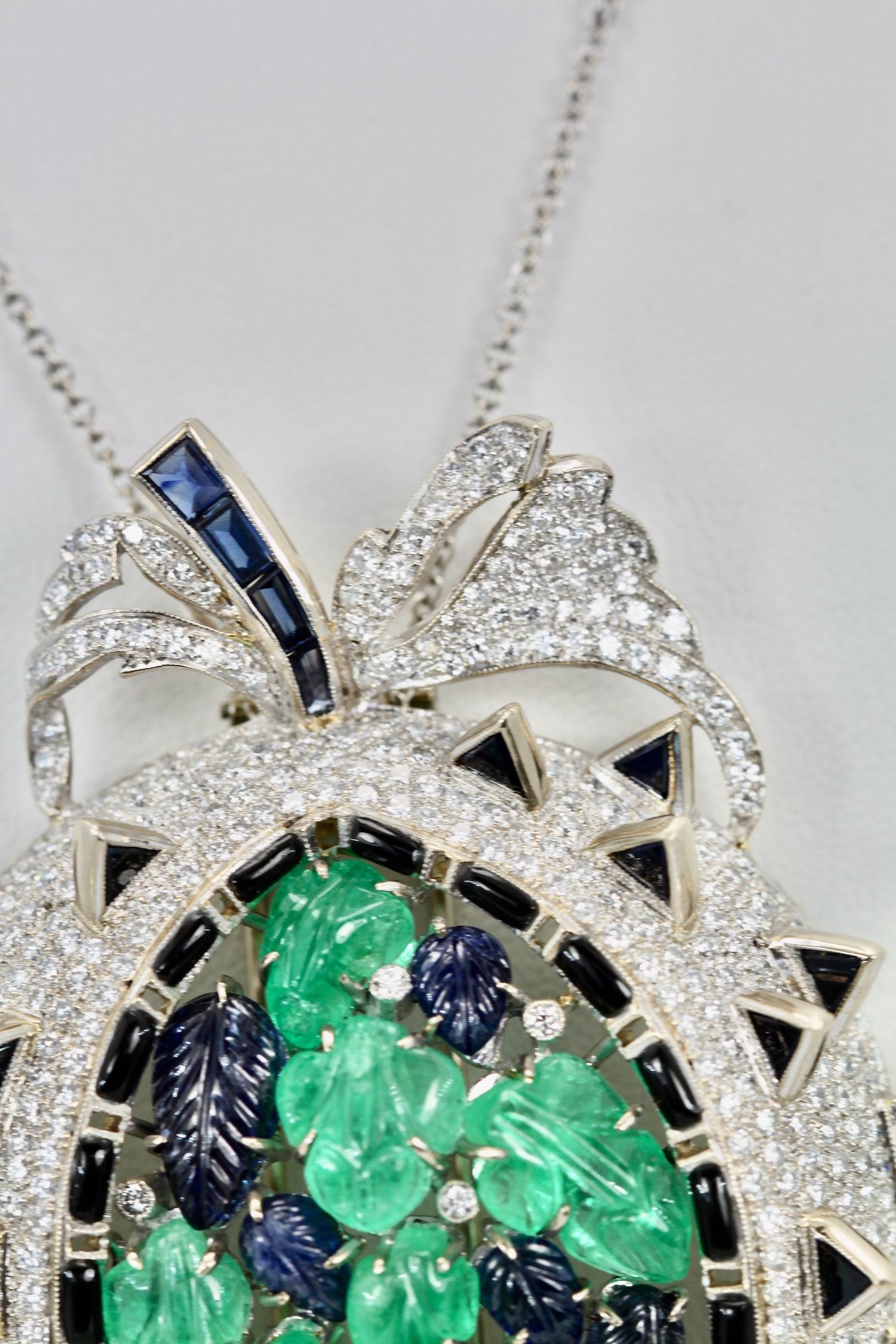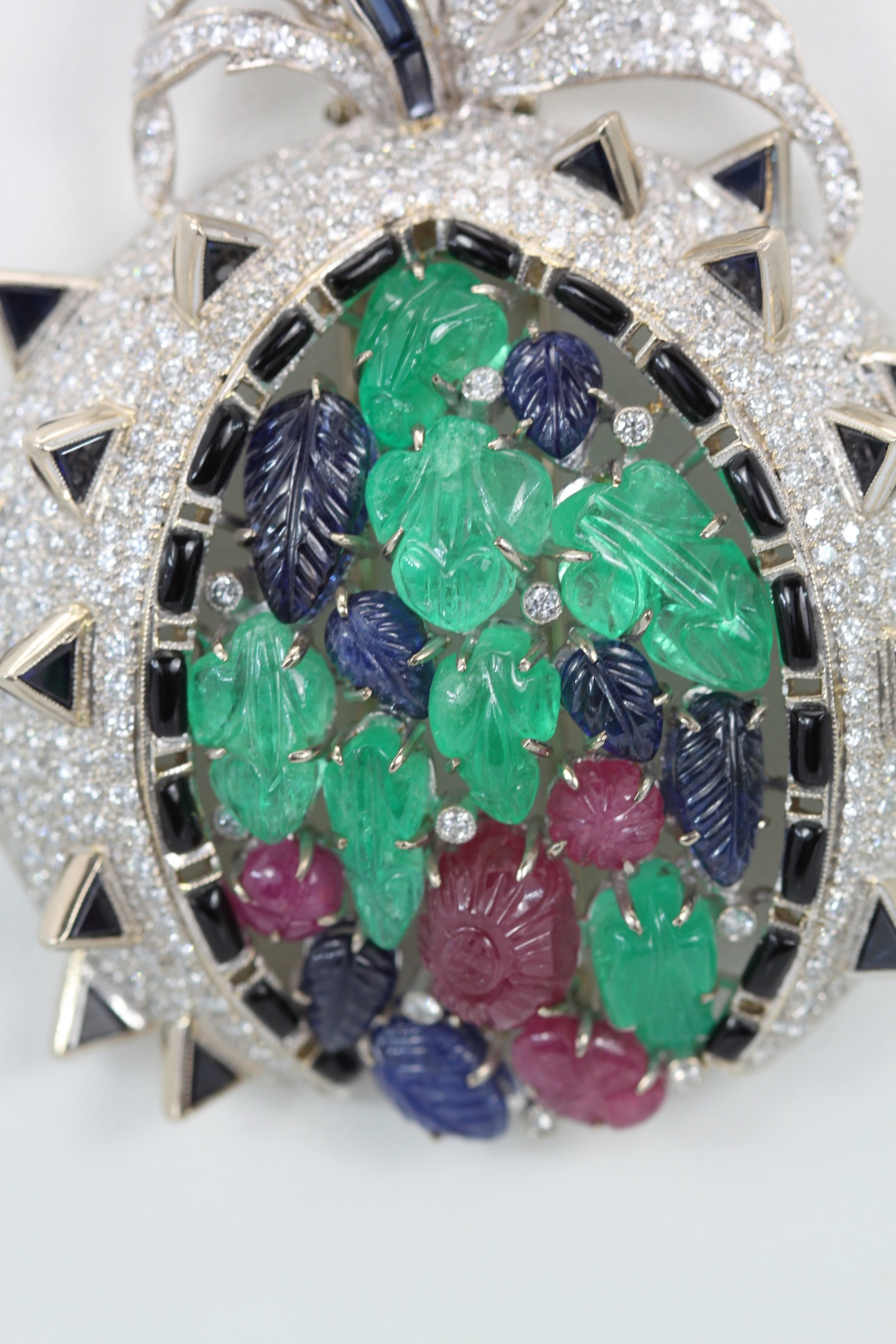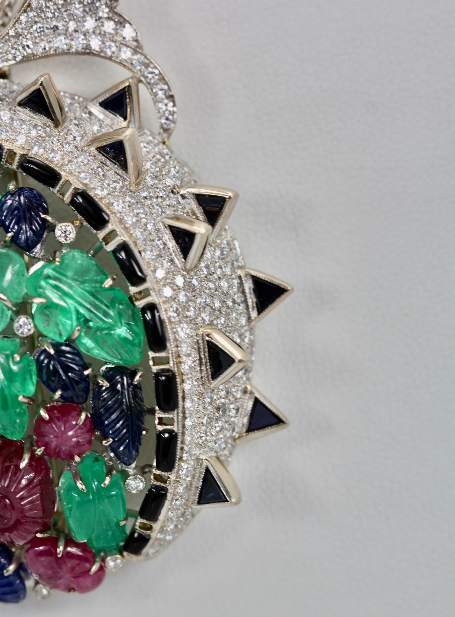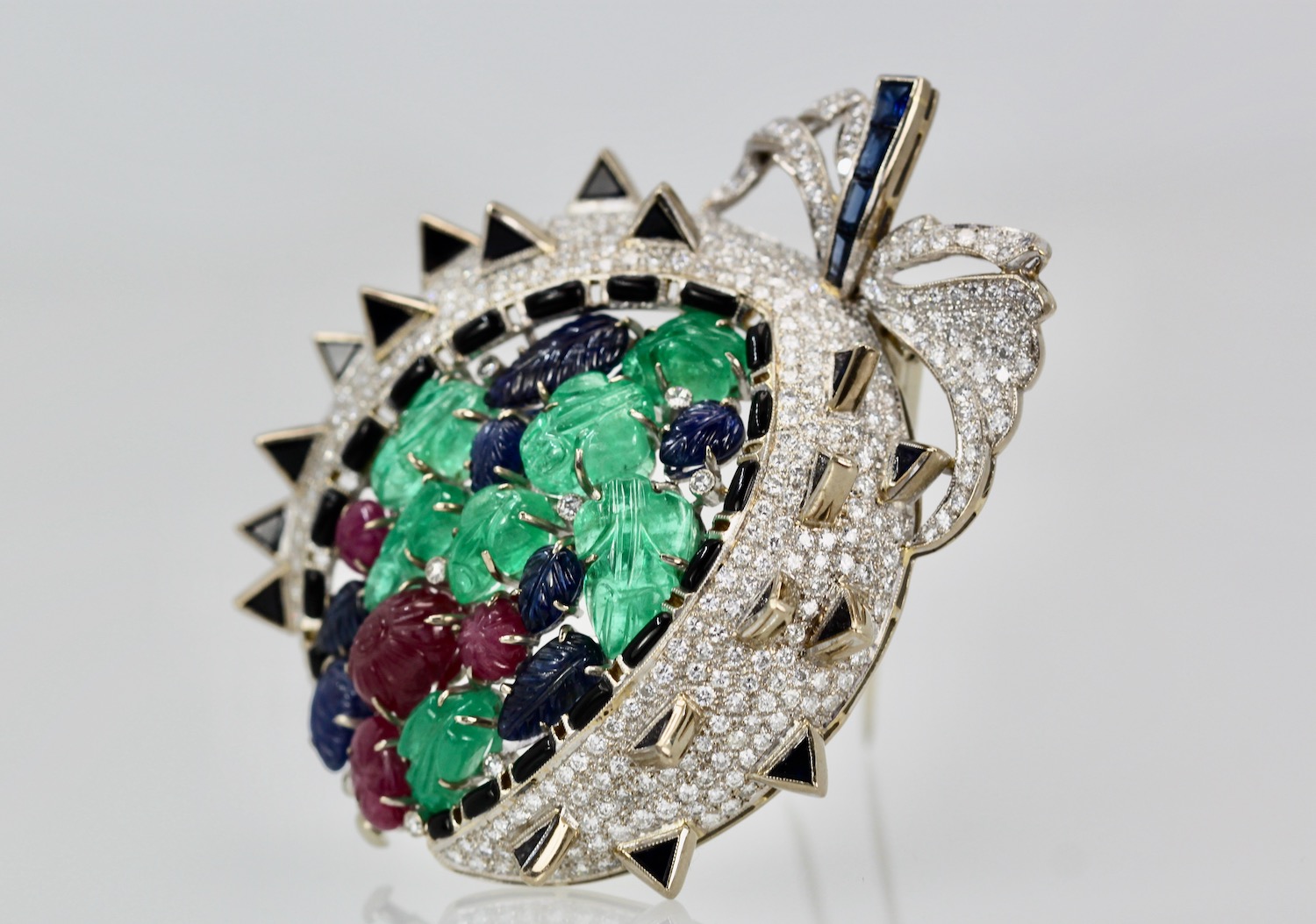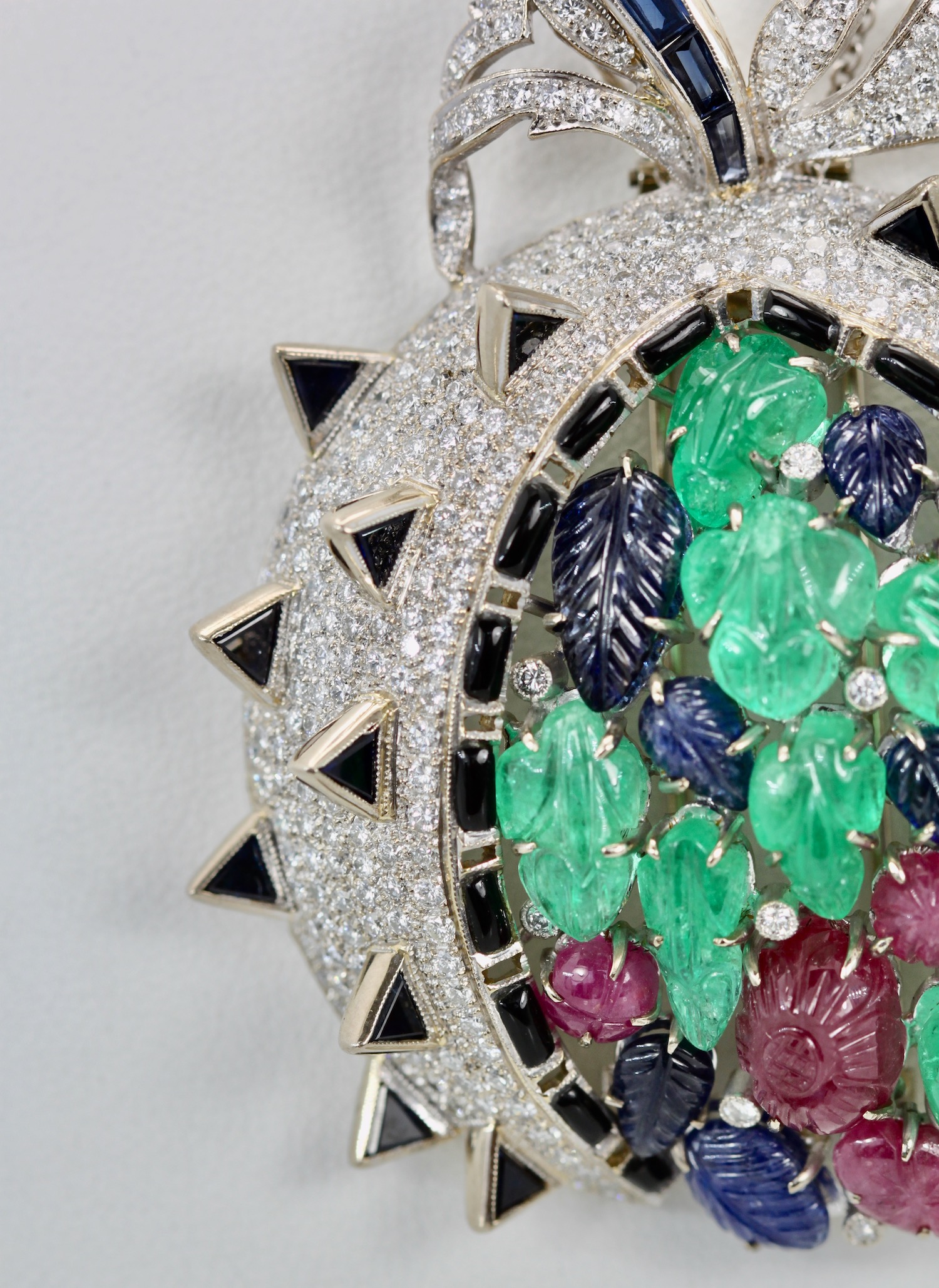 This gorgeous brooch is open like a melon and the seeds are all carved leaves and the Diamonds are the berries. This brooch is large 6.0cm long by 5.5cm wide and weighs a whopping 48.5 grams. There are 18 carved leaves, 7 Emeralds, 7 Sapphires, 4 Ruby's and 9 small Diamonds also Sapphire baguette stem, Black enamel spikes and surround. This can be worn as a brooch or as a pendant, versatile and special.I have NEVER seen another quite like it and I do not think I ever will as this really is quite special.