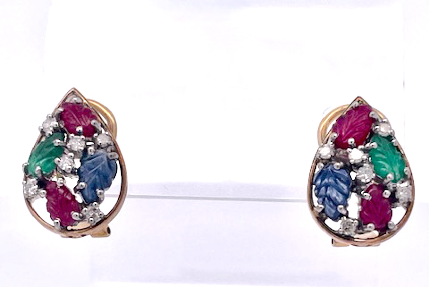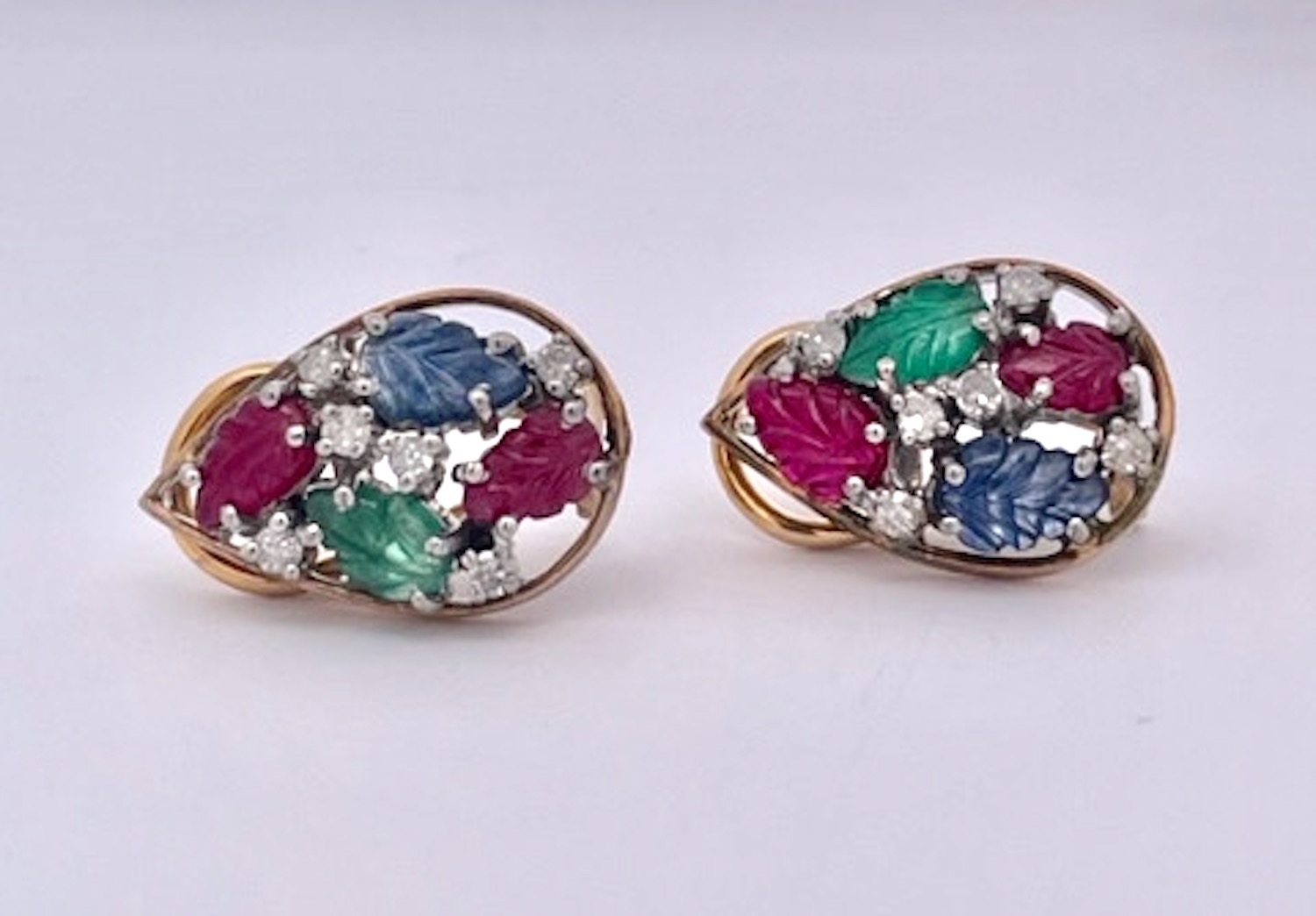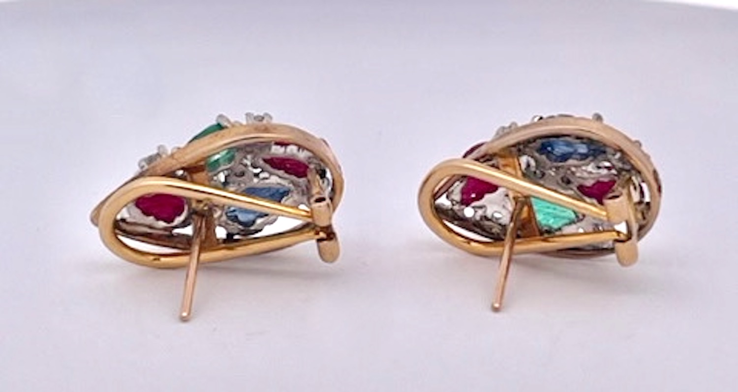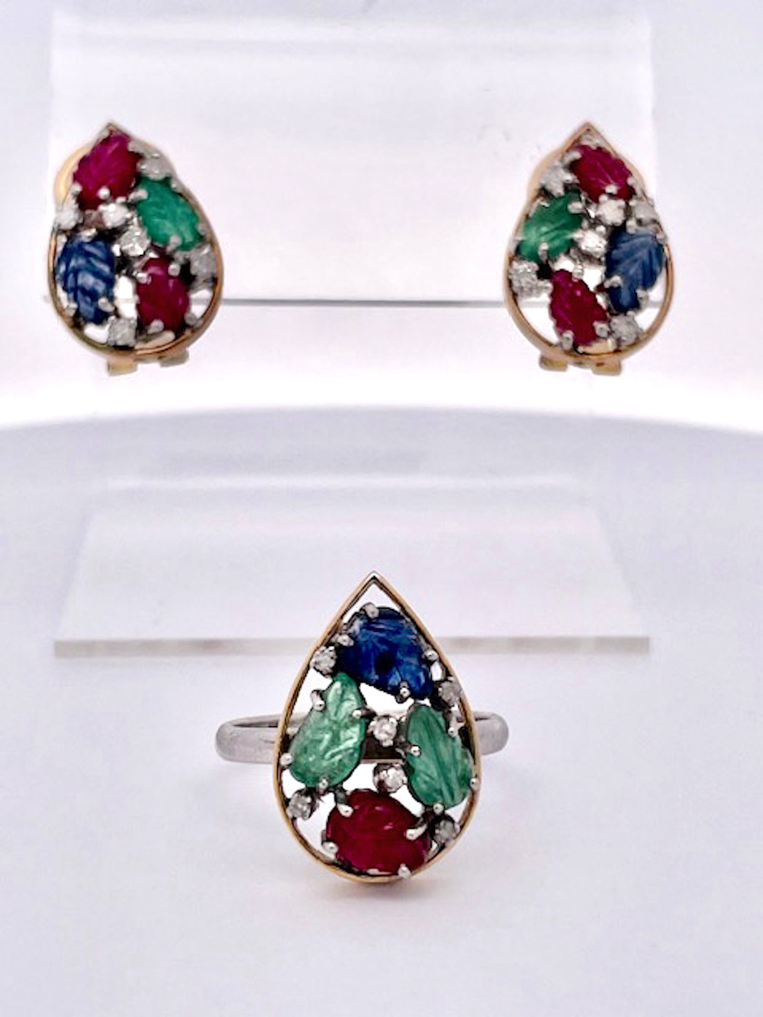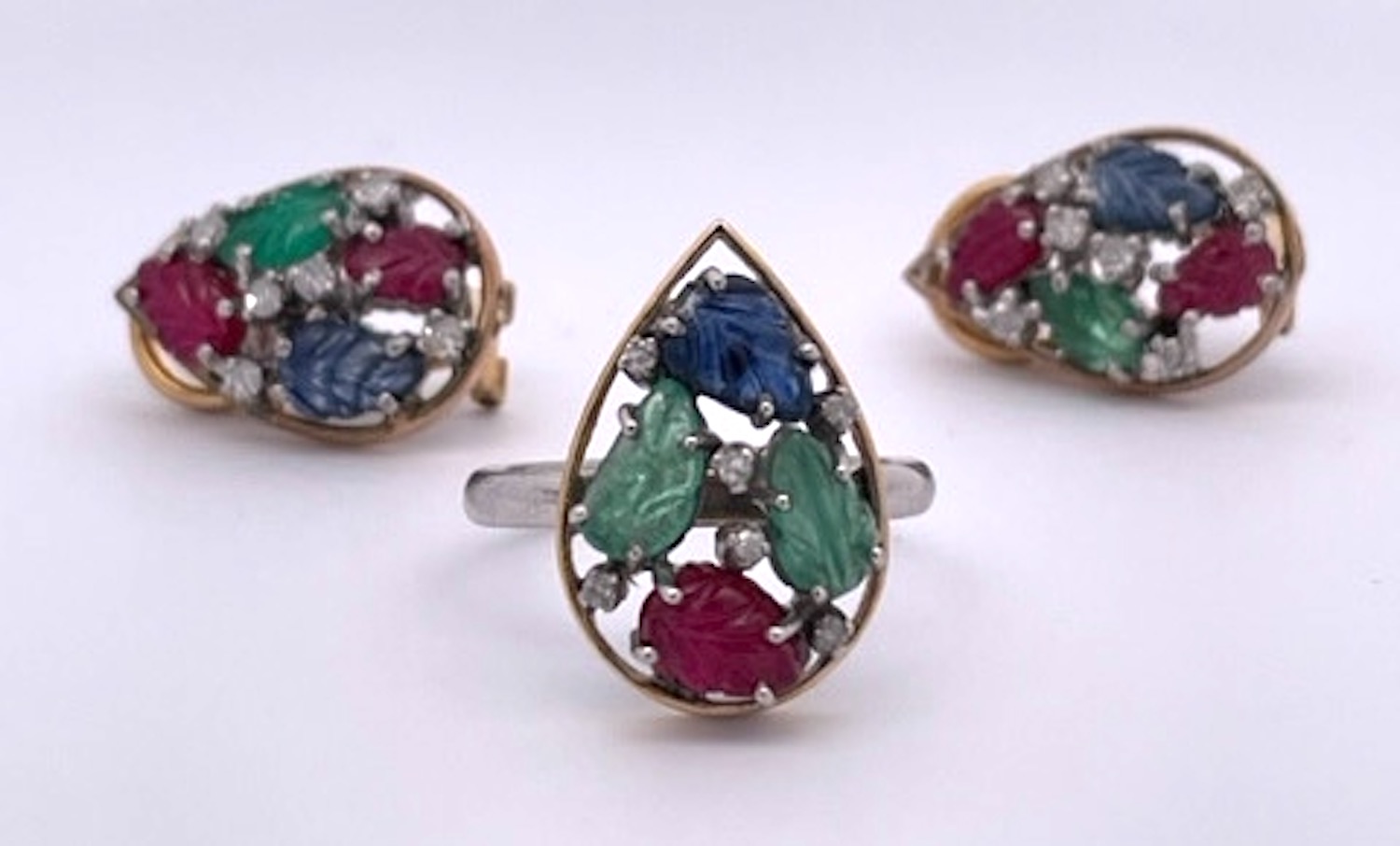 I purchased this set from an auction house in the Netherlands and was so happy to get them. This Tutti Frutti set is highly unusual as it is a matched set in 14K Gold. The earrings are set in a teardrop setting with two (2) rubies, one (1) Emerald and one (1) Blue Sapphire each. They are set with small Diamonds throughout. The ring is the same teardrop shape but with two (2) Emeralds, one (1) Ruby and one (1) Blue Sapphire. and also sutted with Diamonds. These are all carved stones in a leaf pattern.m Tutti Frutti jewelry began with Cartier visiting India in the early 1900 and saw their gemstones carved in this fashion and set together to create a distinctive pattern. It was all the rage in the 1920's. This set is new around 2000 yet it provides the same punch at a much lower price point.
