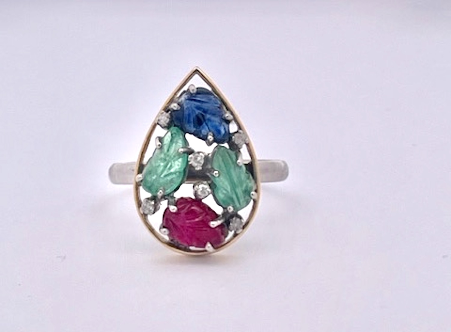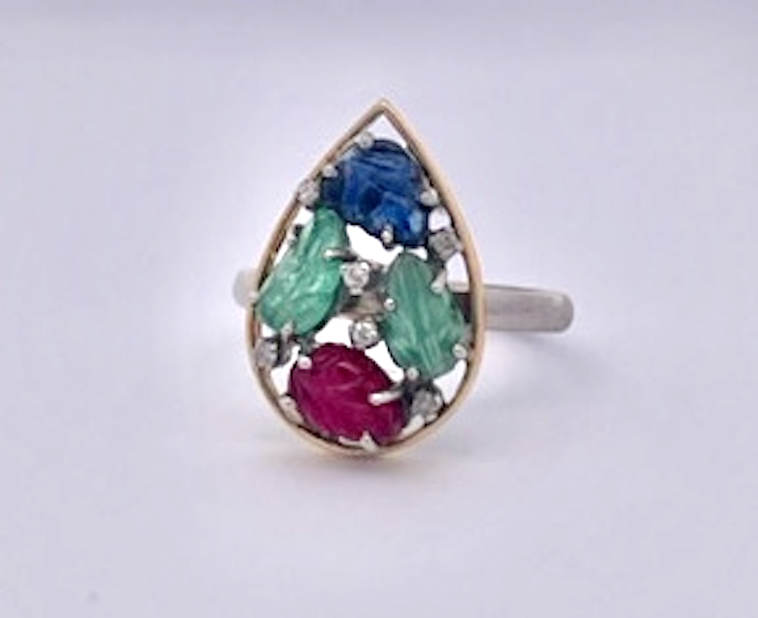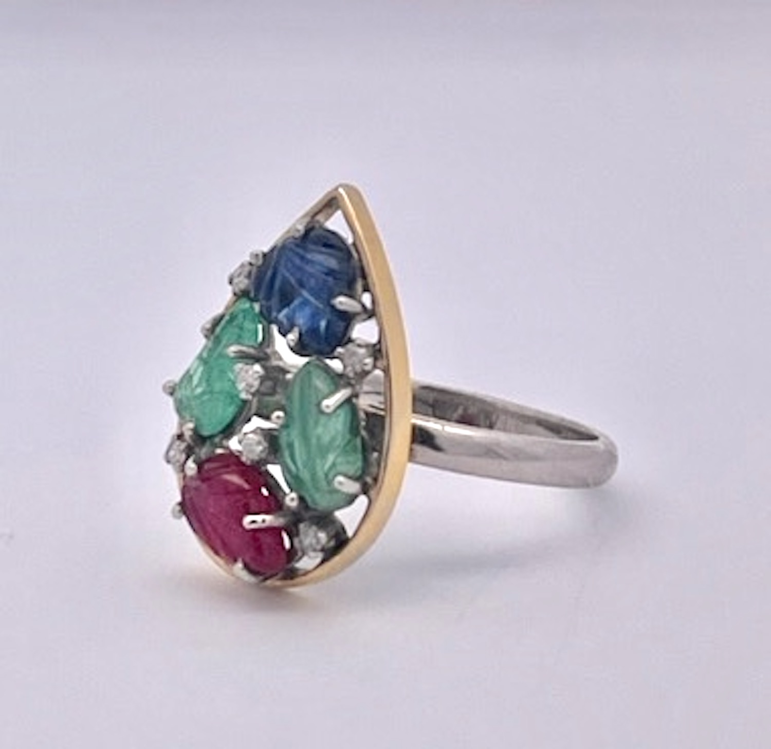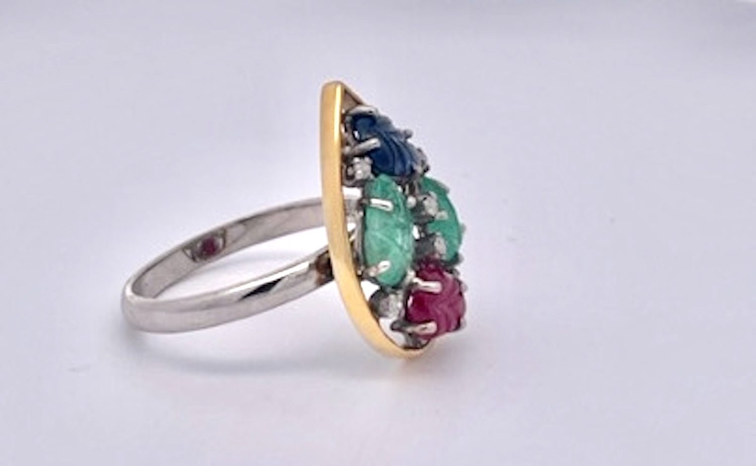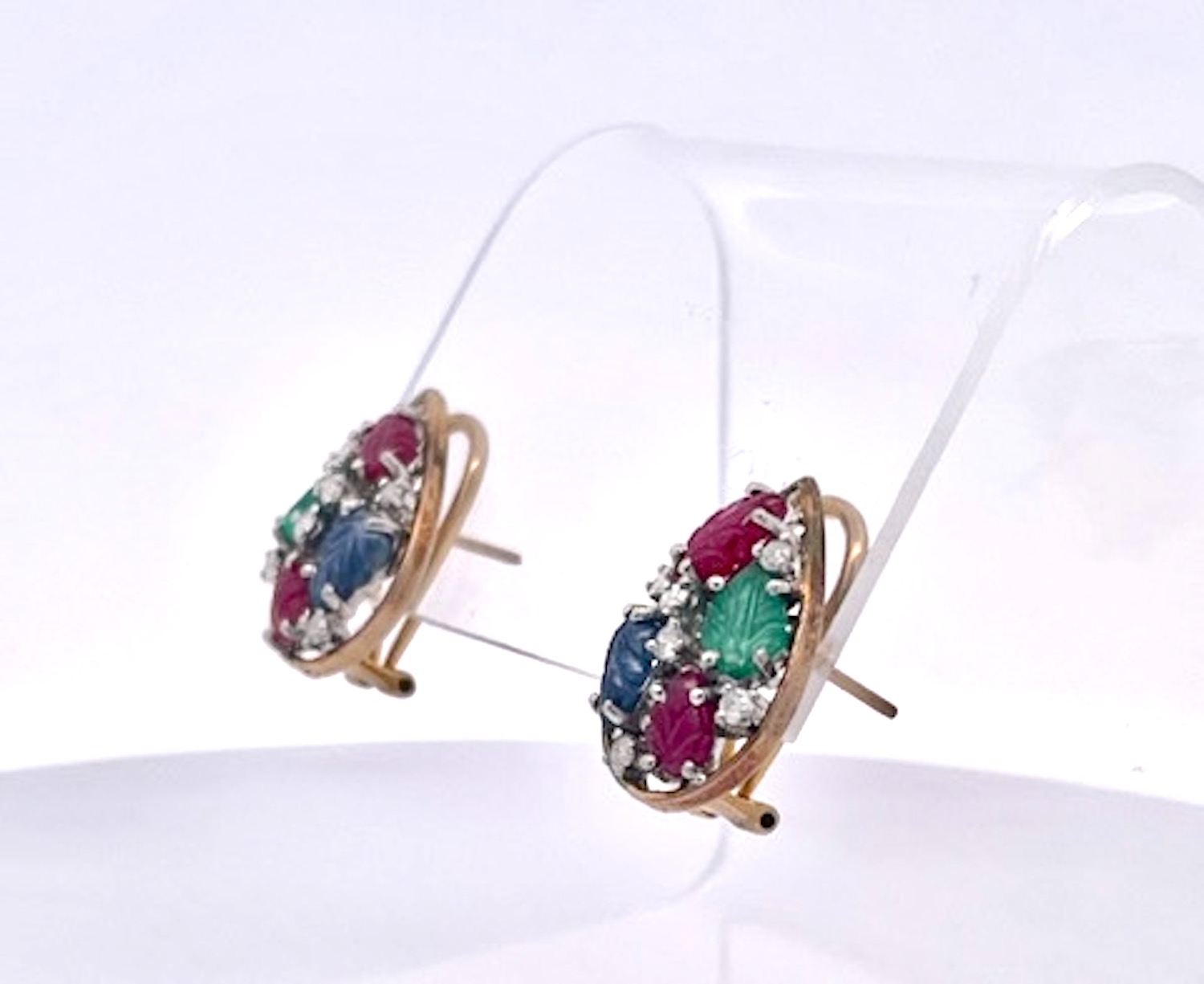 I purchased this set from an auction house in the Netherlands and was so happy to get them. This Tutti Frutti set is highly unusual as it is a matched set in 14K Gold. The earrings are set in a teardrop setting with two (2) rubies, one (1) Emerald and one (1) Blue Sapphire each. They are set with small Diamonds throughout. The ring is the same teardrop shape but with two (2) Emeralds, one (1) Ruby and one (1) Blue Sapphire. and also sutted with Diamonds. These are all carved stones in a leaf pattern.m Tutti Frutti jewelry began with Cartier visiting India in the early 1900 and saw their gemstones carved in this fashion and set together to create a distinctive pattern. It was all the rage in the 1920's. This set is new around 2000 yet it provides the same punch at a much lower price point.