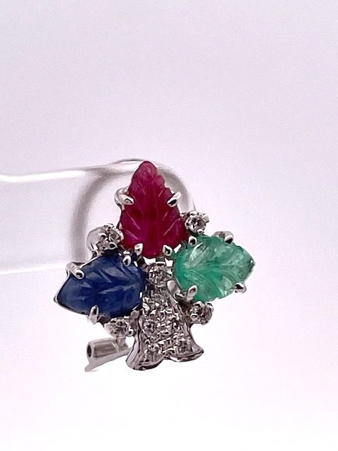 Category: Earrings Tags: 18k white gold, Carved leaves, Diamonds, emeralds, Rubies, Saphires, Tutti Frutti