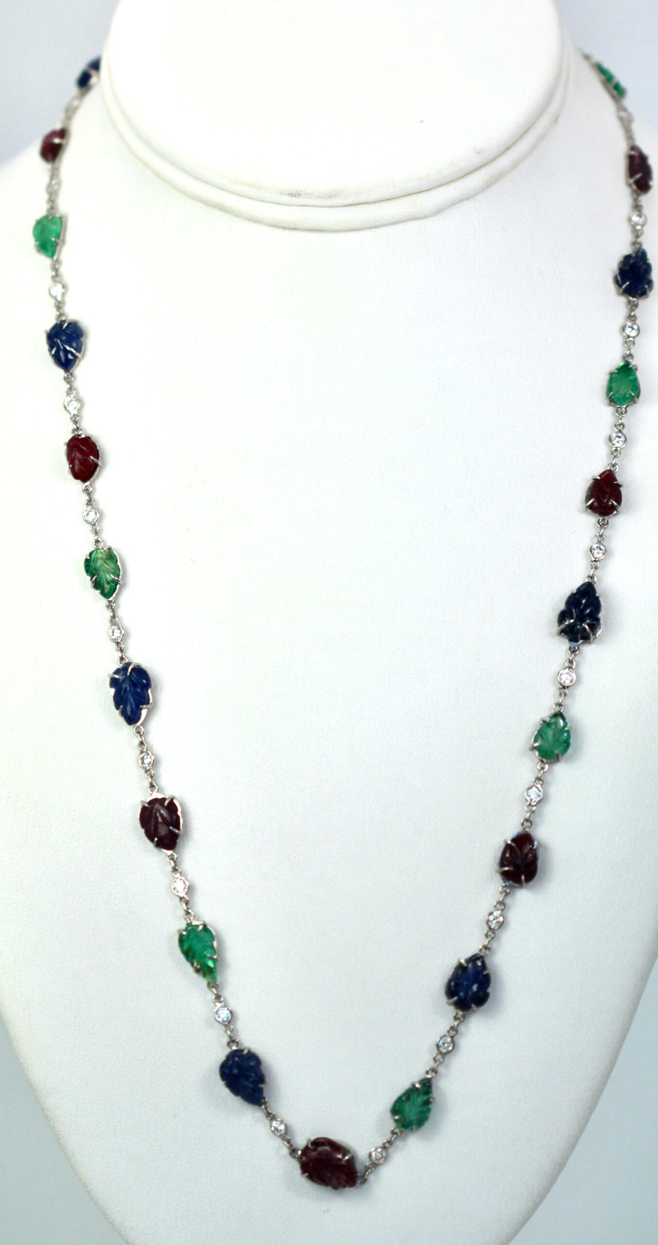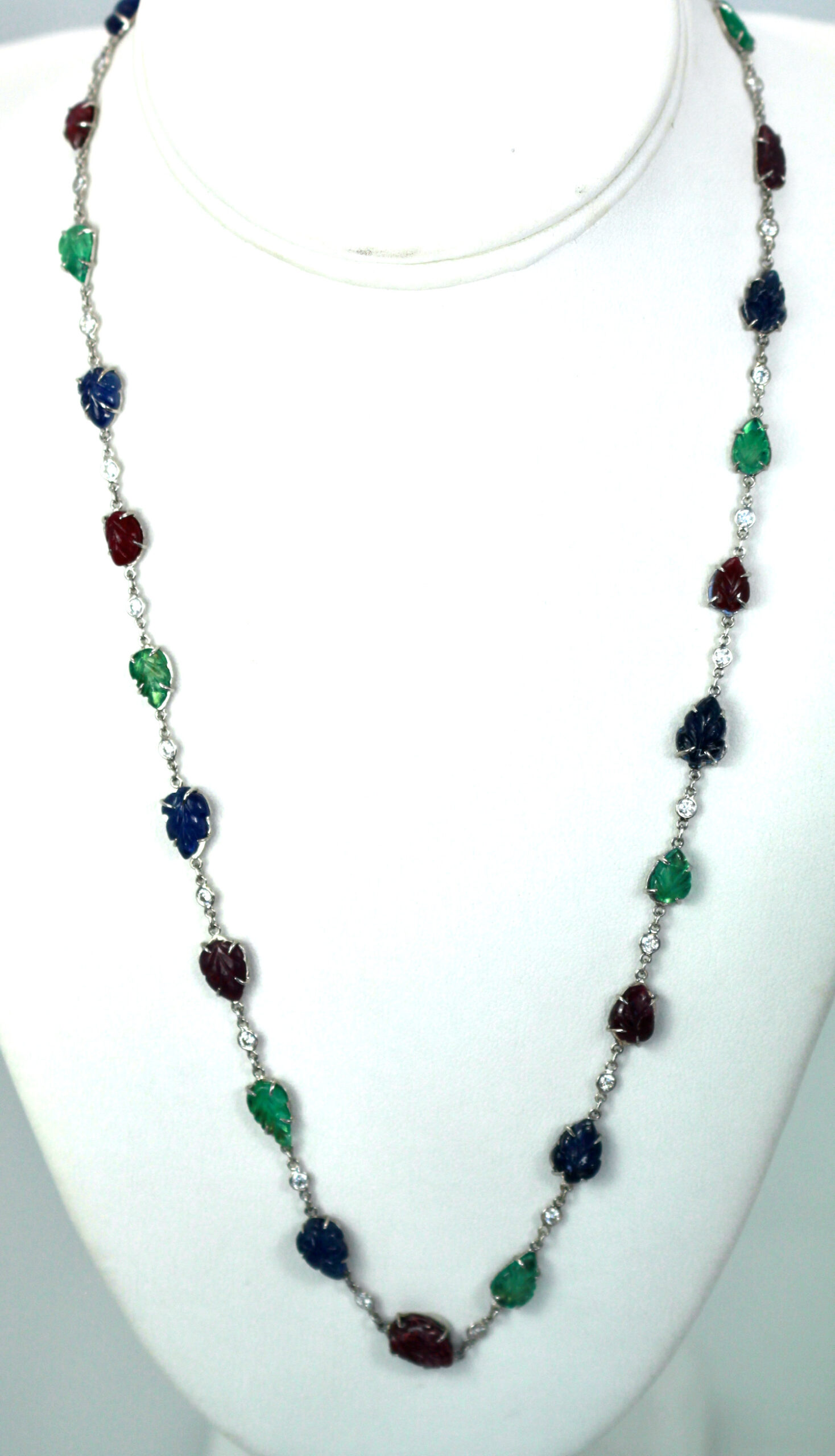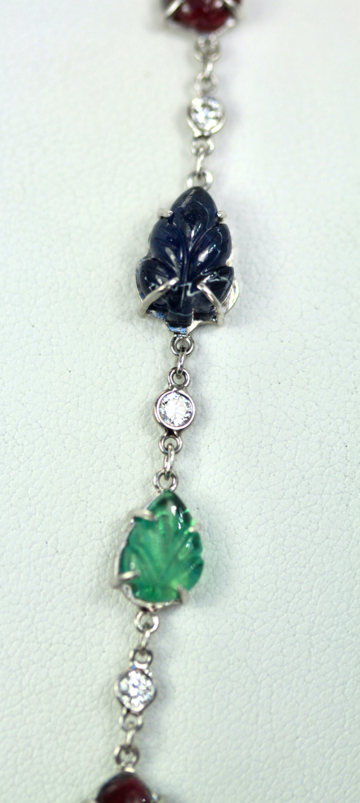 I adore Tutti Frutti pieces but the originals by Cartier etc. are out of the price range for most. I am always on the lookout for these pieces. This necklace I had made for me as I collected carved gemstones in Ruby, Sapphire and Emerald and I added Diamonds. The length is 22" long, made from 18K white gold, and weighs 21.7 grams. There are 24 (twenty-four) Diamonds G-H and SI and weight in at 2.20 carats. There are 9 carved Rubies, 8 (eight) Sapphires and 8 (eight) Emeralds. There are 25 carved stones, each weighting in at 1/14 to 2 carats each. Minimum carat weight 25 carats to 50 carats for the gemstones only add the Diamonds at 2.20 carats and you have an amazing necklace. I would wear this alone or add a long Diamond encrusted chain.