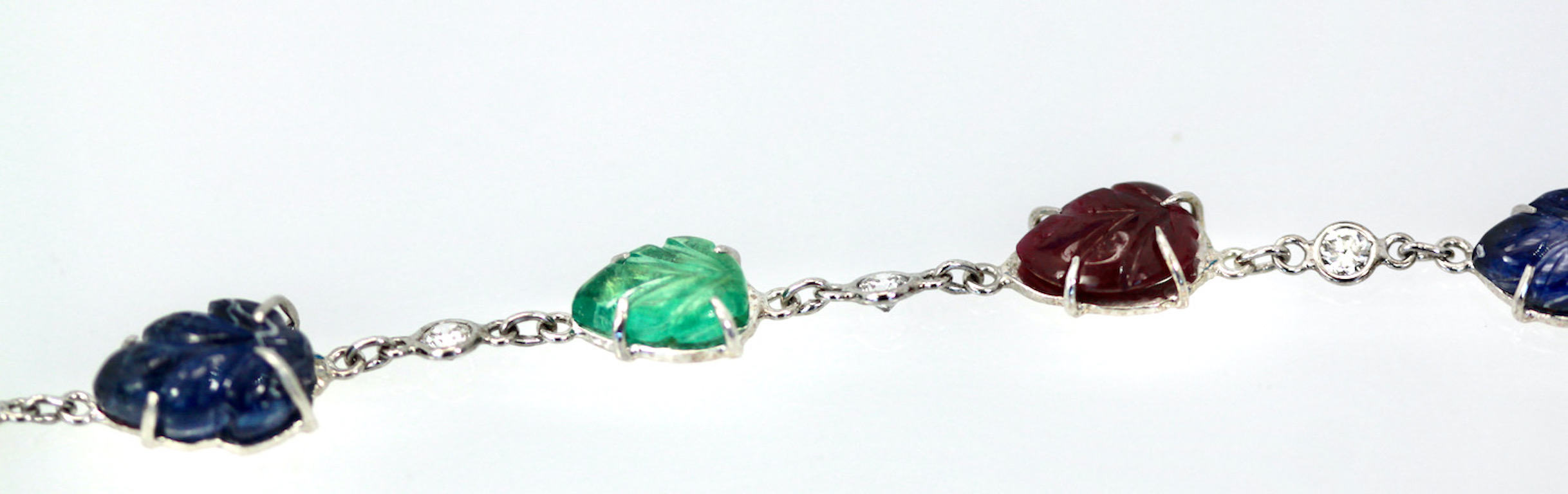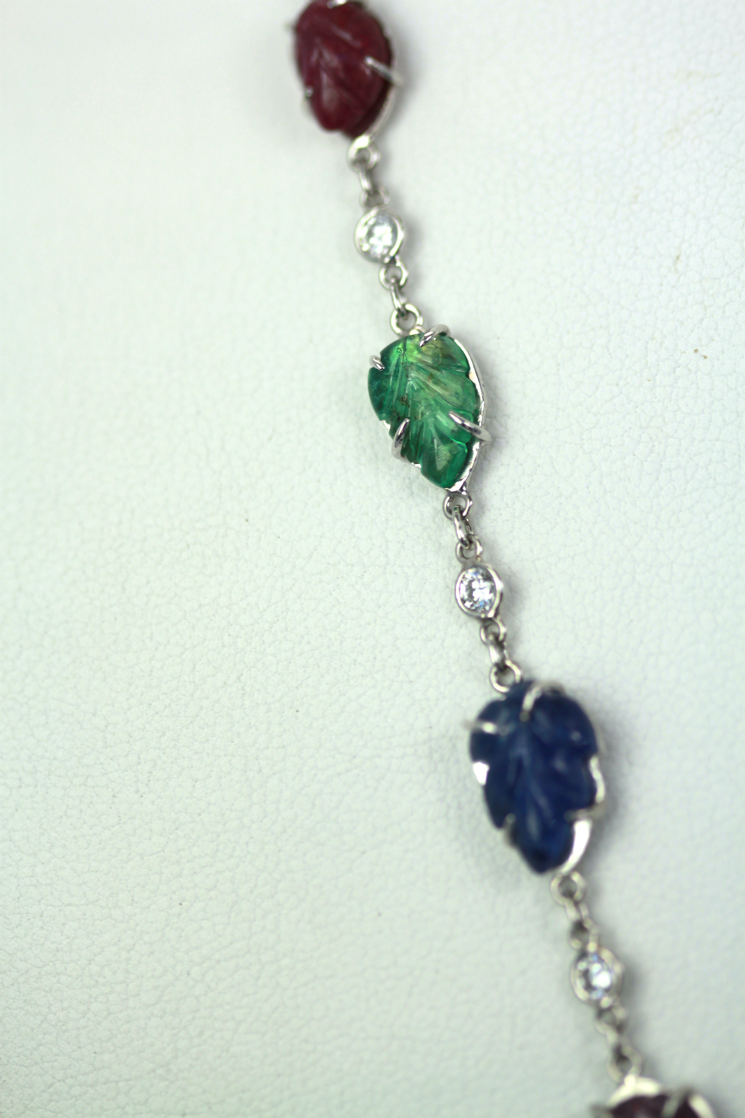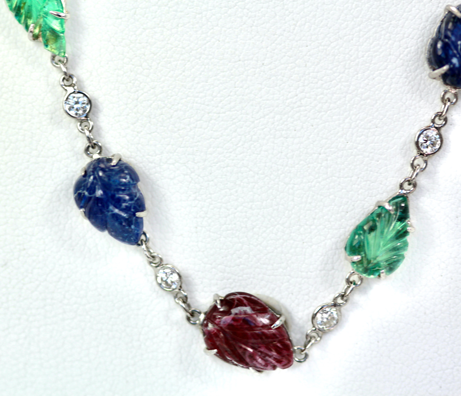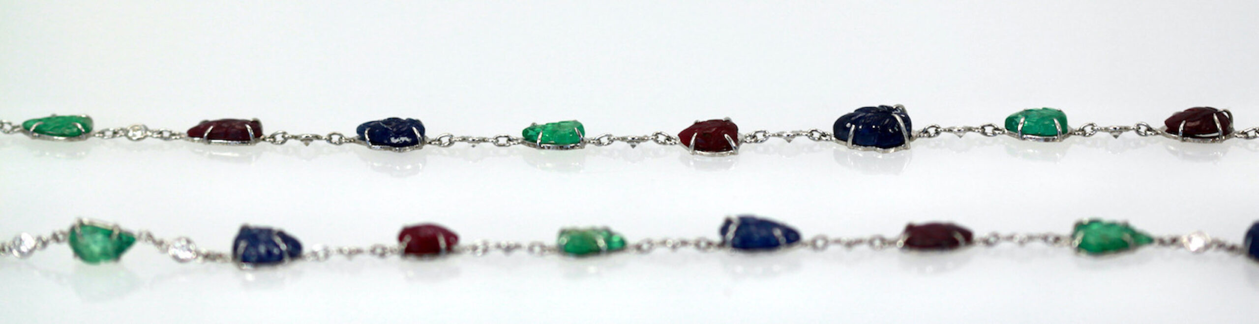 I adore Tutti Frutti pieces but the originals by Cartier etc. are out of the price range for most. I am always on the lookout for these pieces. This necklace I had made for me as I collected carved gemstones in Ruby, Sapphire and Emerald and I added Diamonds. The length is 22" long, made from 18K white gold, and weighs 21.7 grams. There are 24 (twenty-four) Diamonds G-H and SI and weight in at 2.20 carats. There are 9 carved Rubies, 8 (eight) Sapphires and 8 (eight) Emeralds. There are 25 carved stones, each weighting in at 1/14 to 2 carats each. Minimum carat weight 25 carats to 50 carats for the gemstones only add the Diamonds at 2.20 carats and you have an amazing necklace. I would wear this alone or add a long Diamond encrusted chain.