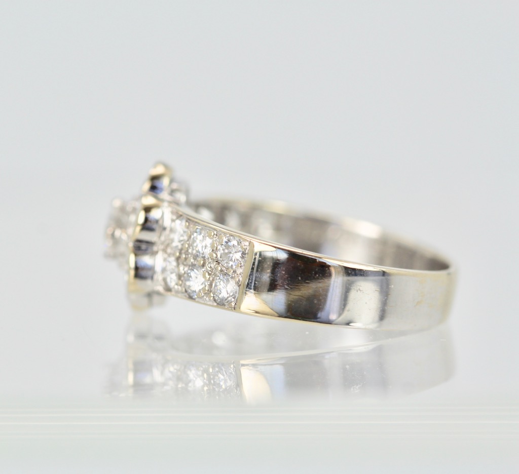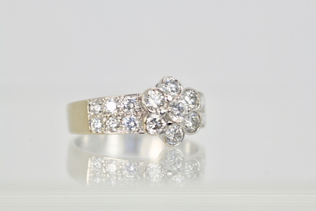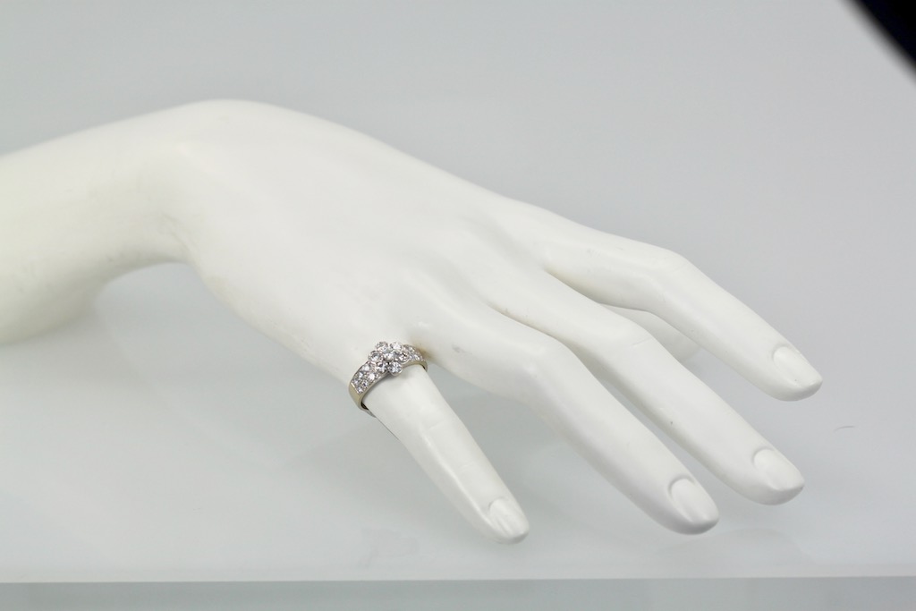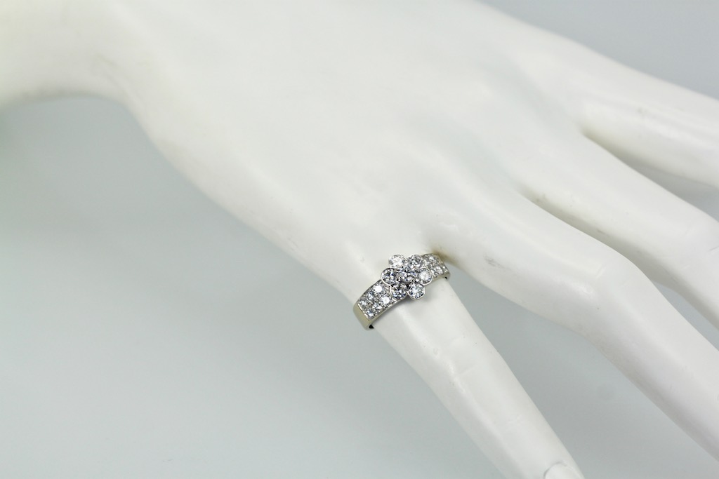 First of all, this gorgeous Van Cleef & Arpels Fleurette Diamond Ring is now discontinued, but it is just lovely. It would work beautifully with the two other Fleurette pieces I have listed. Furthermore, this ring comes with an Appraisal for $18,500. That is the price VCA sold it for when created. Nevertheless, I have listed this ring far below the appraisal price. This ring has 1. 12 Carats VVS E, F seven Diamonds which make the flower and 12 Diamonds that line the shank. The head of the ring measures 9.5mm and the band measures 3.5mm Size 6. This Van Cleef & Arpels Fleurette Diamond Ring weighs 3.6 grams.