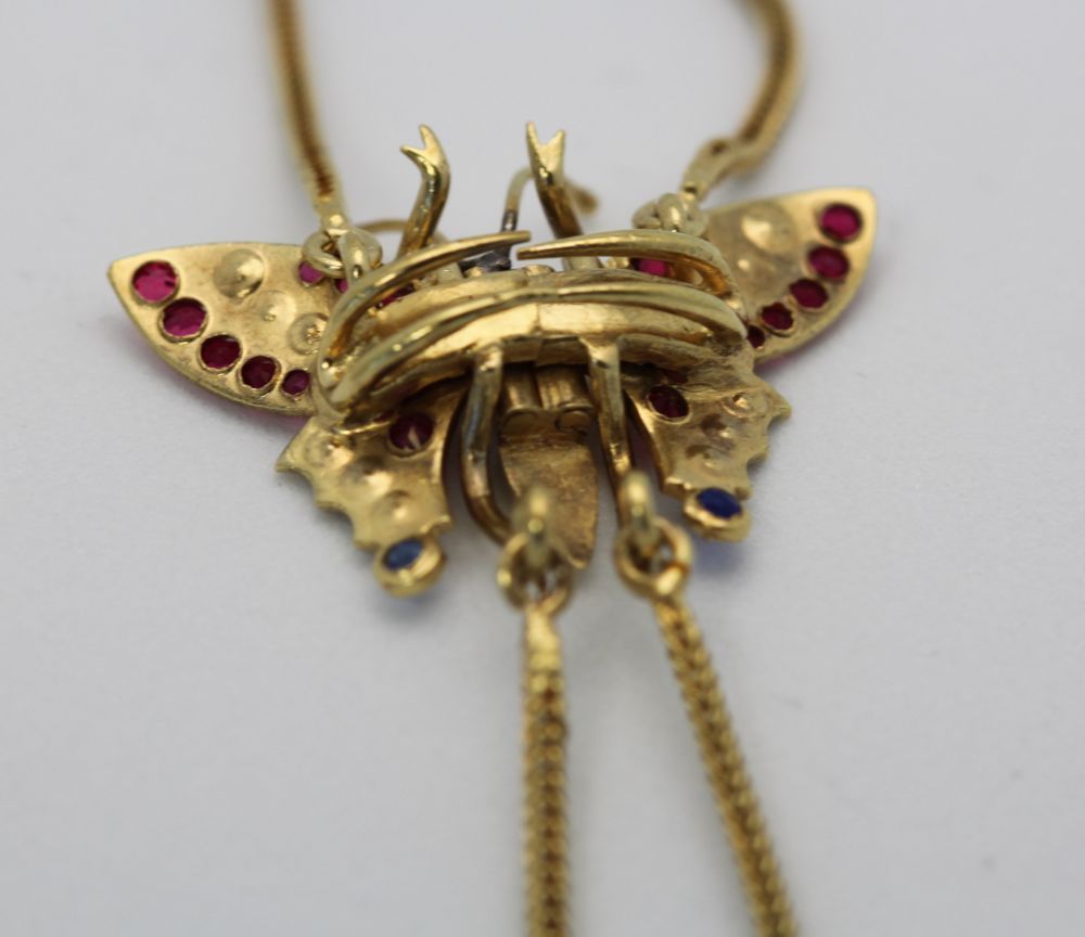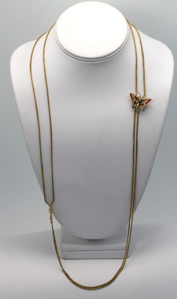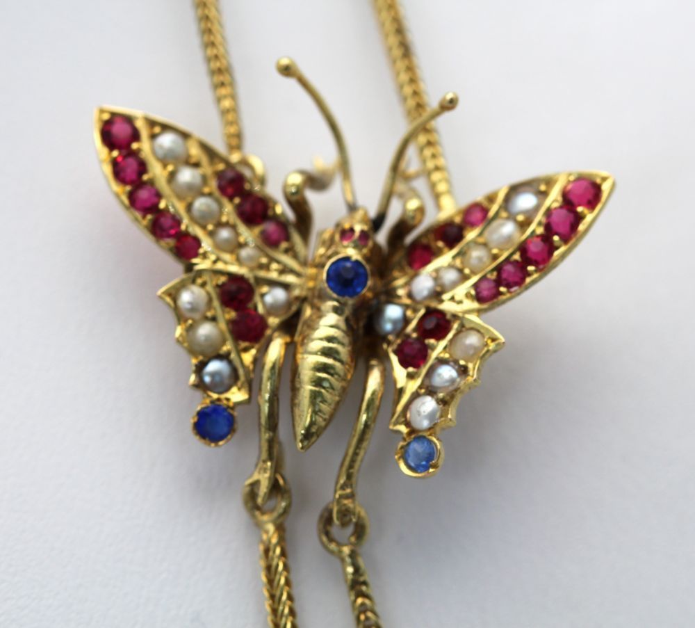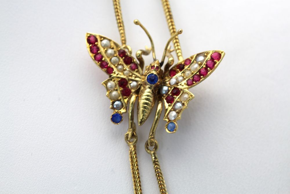 This Victorian Butterfly Mitten/Muff Extra Long Chain is simple yet elegant and can be worn in many different ways. The butterfly's wings squeeze together, causing the little teeth on the back to attach to your clothing and also act as an extra security measure. Also, the butterfly is 14k gold and is set with rubies, sapphires and mabe pearls.