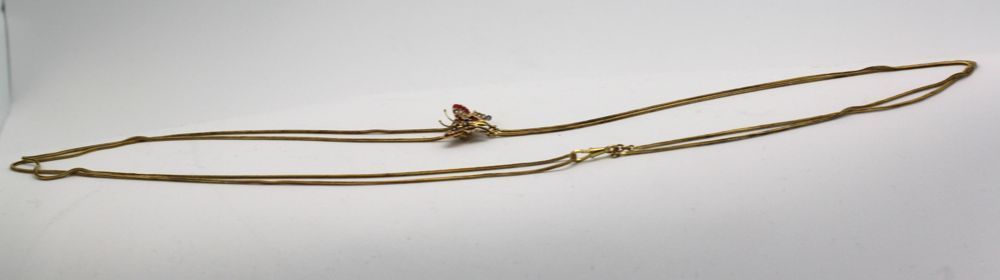 There are 20 round cut rubies with an estimate carat weight of .48 and a color grade of orangey red. In addition, on this there are 3 blue sapphires with an estimated weight of 0.12 carat, color grade blue. The butterfly holds 17 tiny mabe pearls, surface grade Good, luster grade Fair. At 62", this chain is extremely long and can be worn as a lorgnette, doubled or single. Victorian Butterfly Mitten/Muff Extra Long Chain.