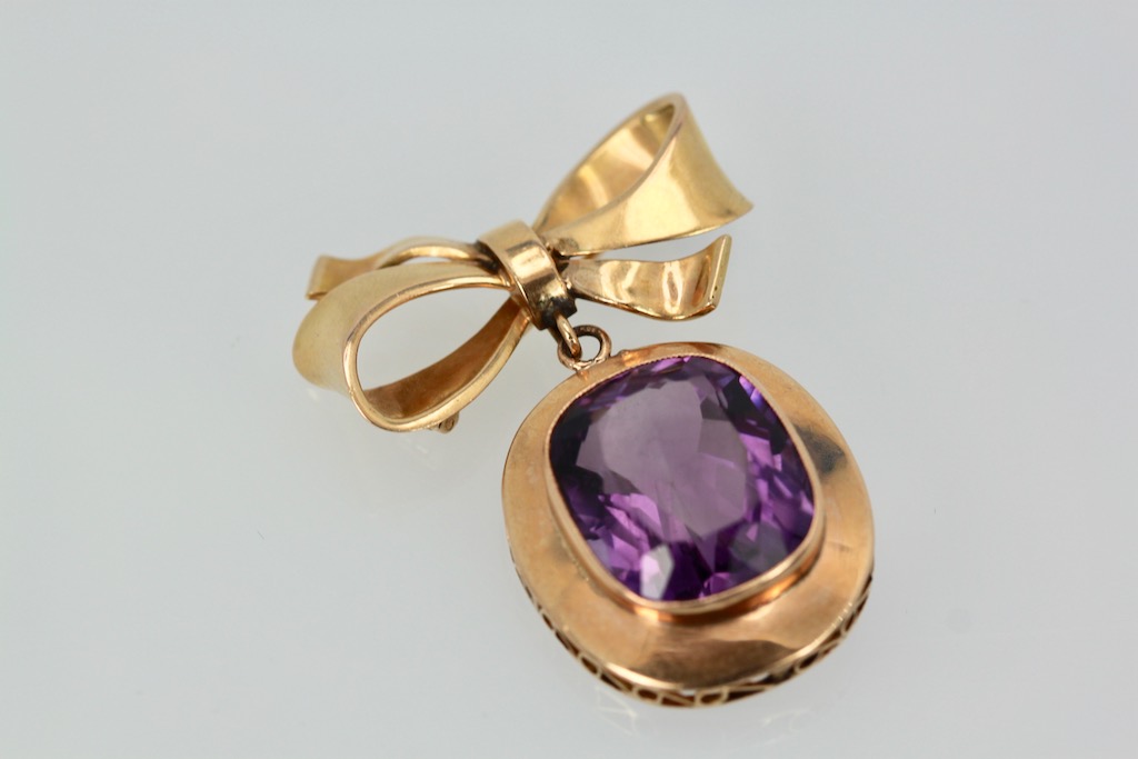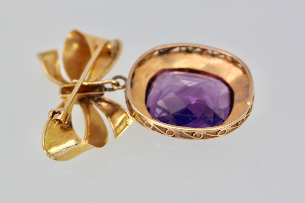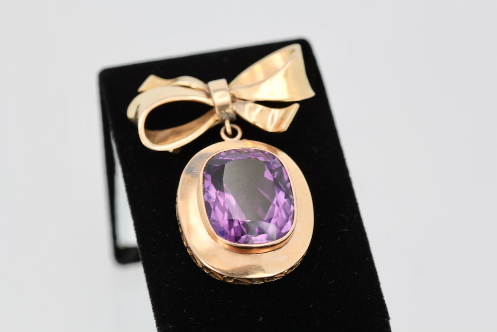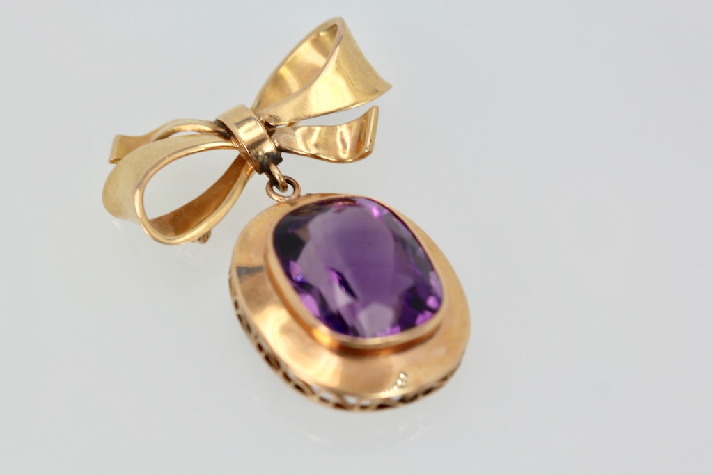 First of all, this lovely Vintage Amethyst Rose Gold Pendant is convertible and can be worn as a brooch/pin or as a pendant. Furthermore, this piece from the 1940’s weighs in at 12.8 grams. Also, it boasts a 20 plus carat gorgeous Amethyst! It is 1 1/8′ long and 1″ wide with bezel and bow it is 1 3/4″ x 3/4″. The Amethyst is flawless in 14K Rose Gold.