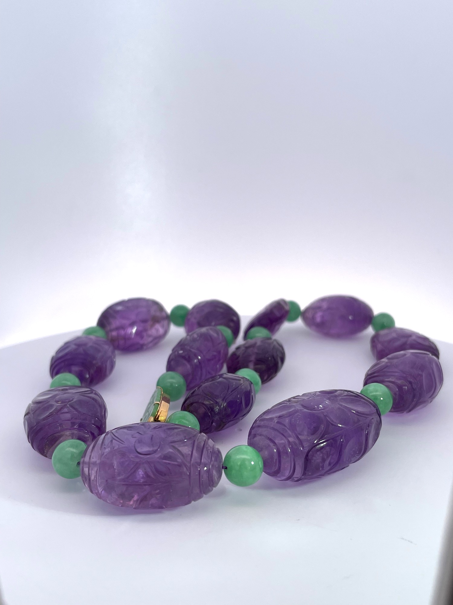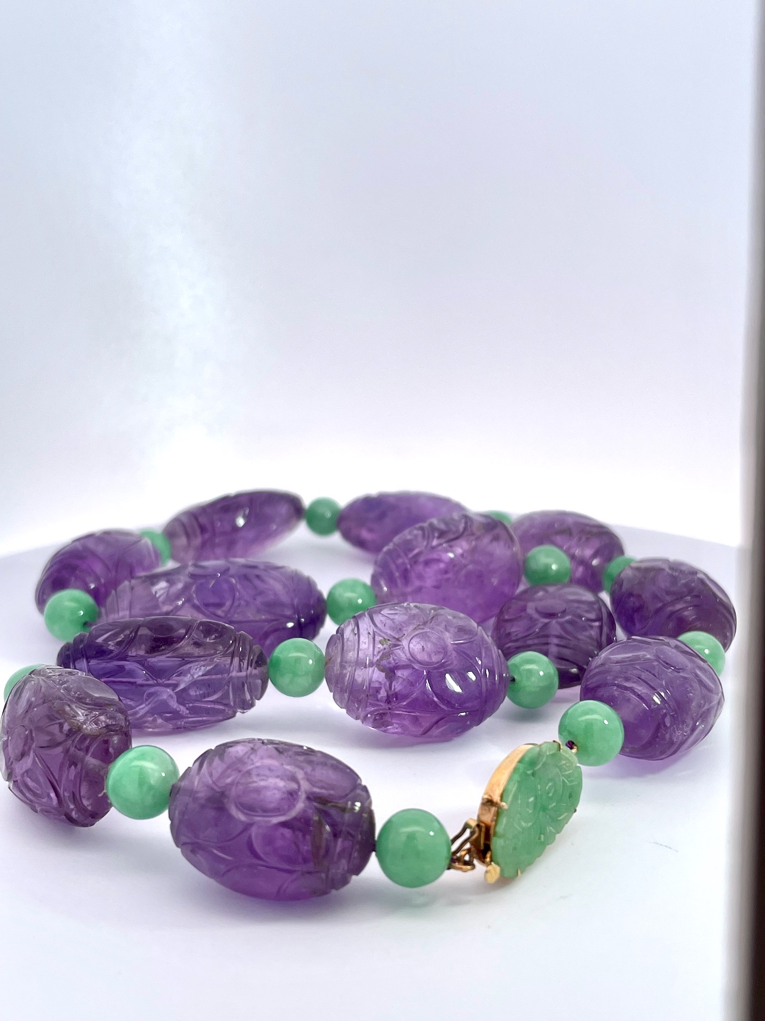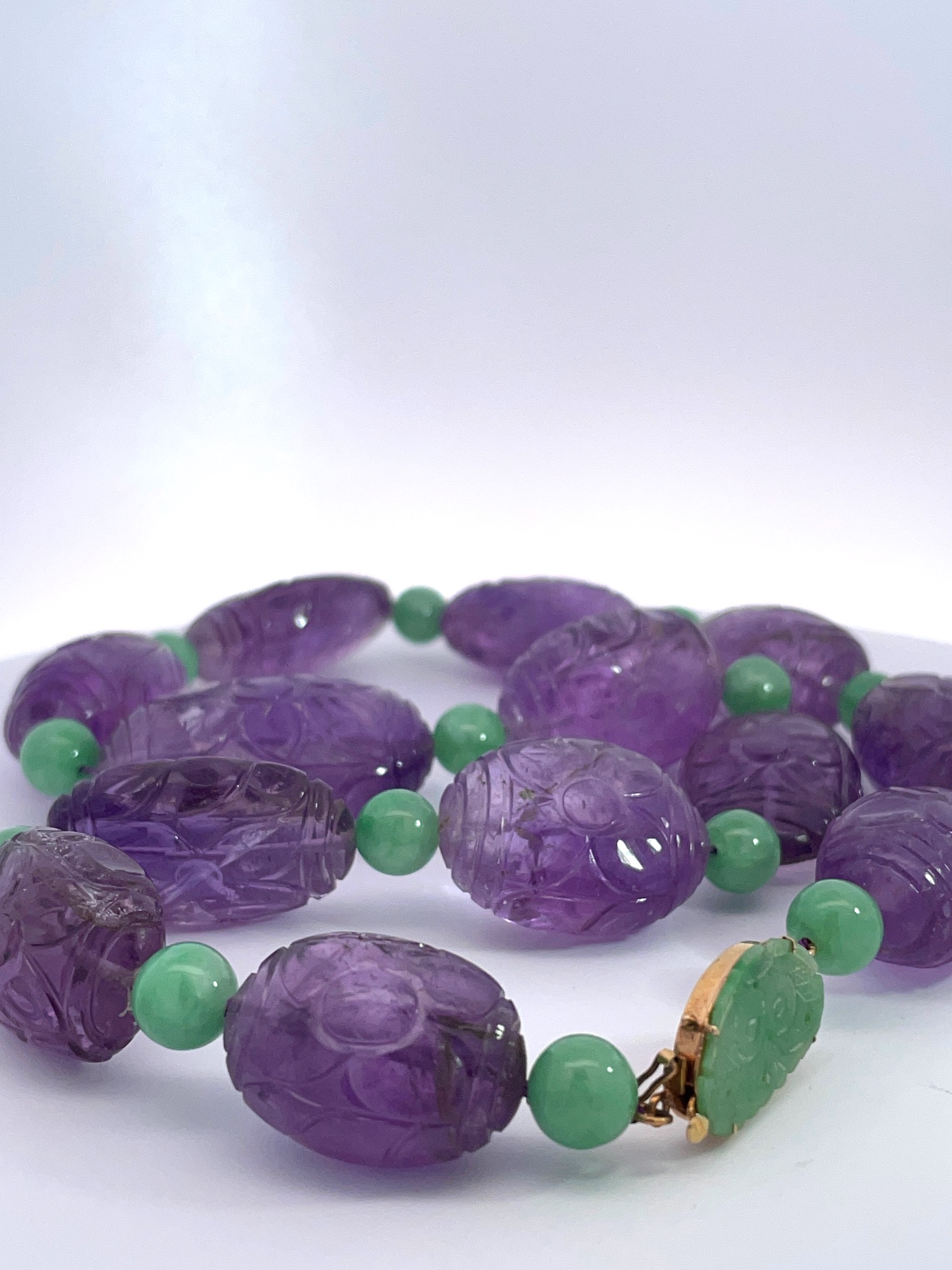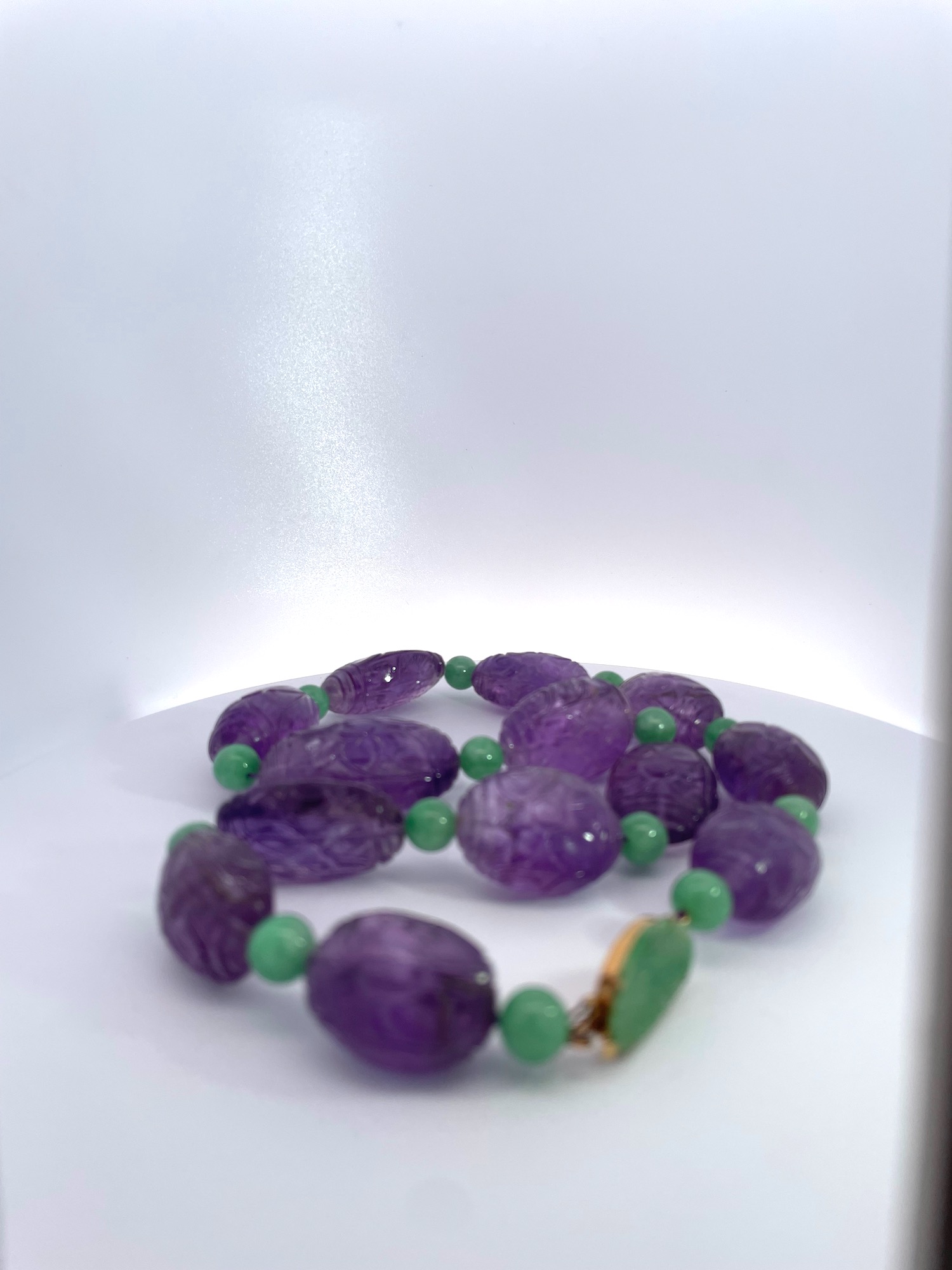 This lovely Amethyst Necklace has detailed carved Amethyst beads. The length is 19 1/2 " long and 3/4" wide. This necklace alternates between Carved Amethyst beads and simple round Jade beads. The closure is Jade with carved double bats. This necklace weighs in at 138.7 grams. I love this as the Amethyst beads almost glow as they move when you move. The details in the beads are special. The color way is exceptional, Amethyst and green Jade wow. I personally love this piece and hope you do too. This is priced to sell so do not wait.