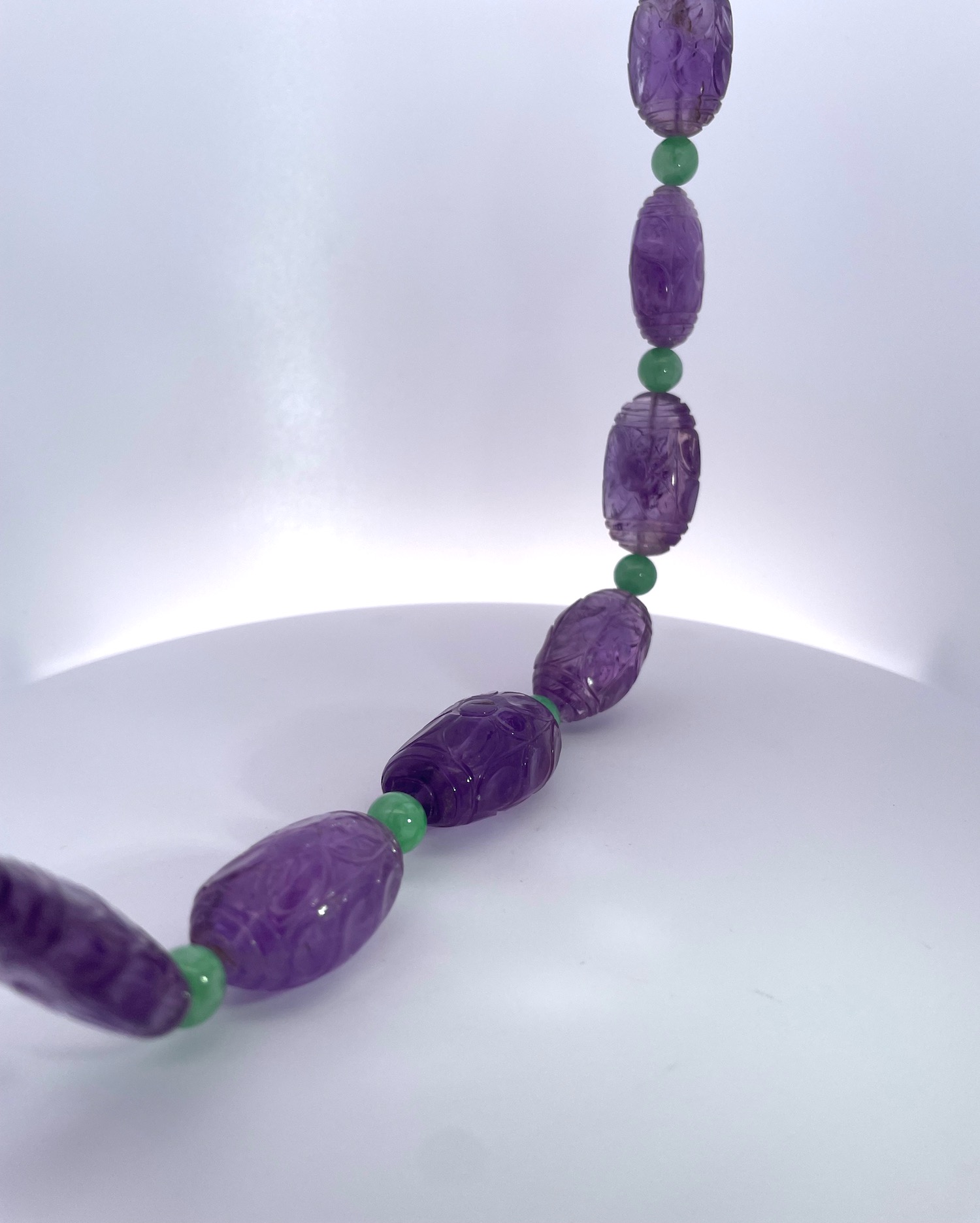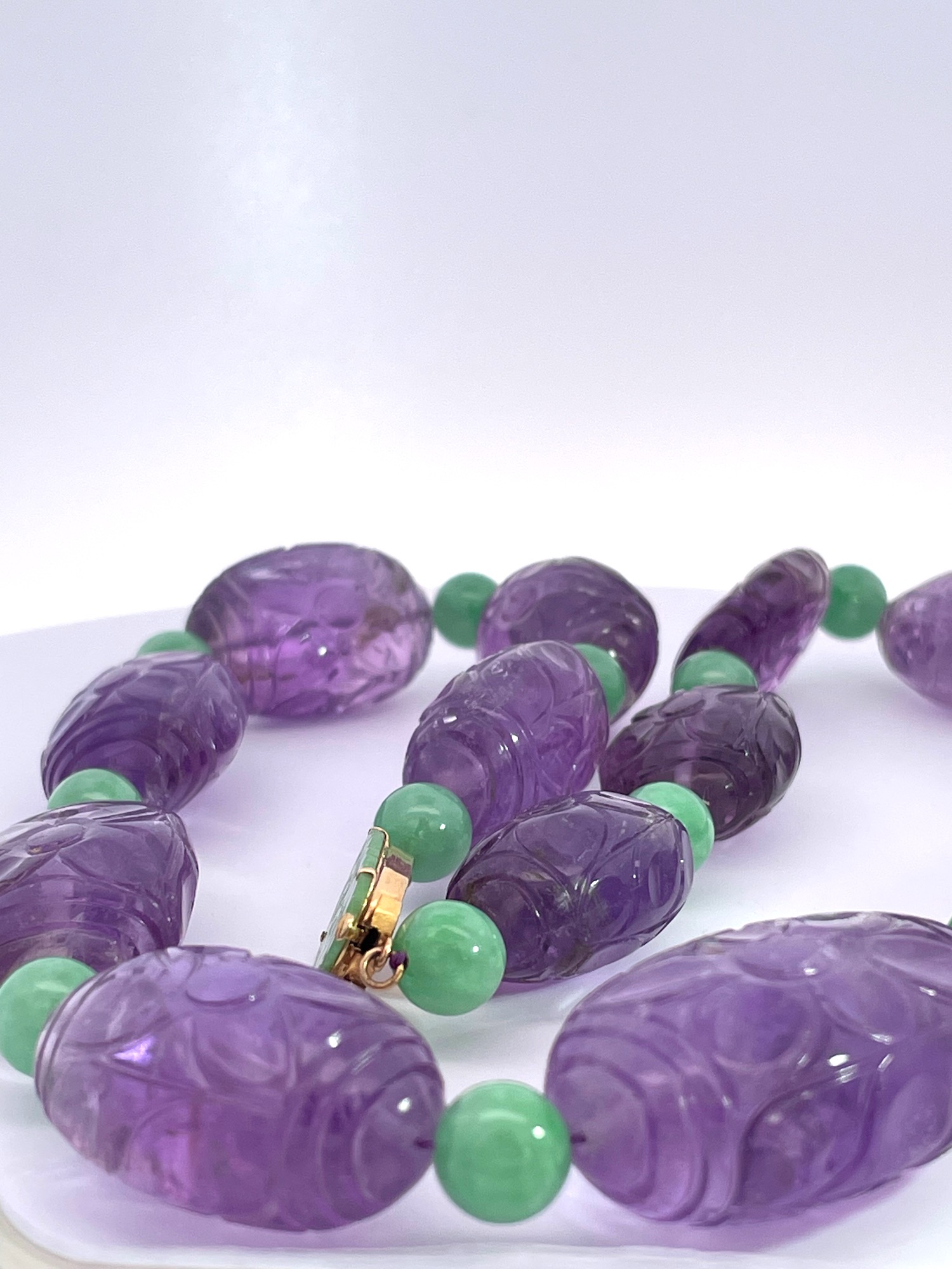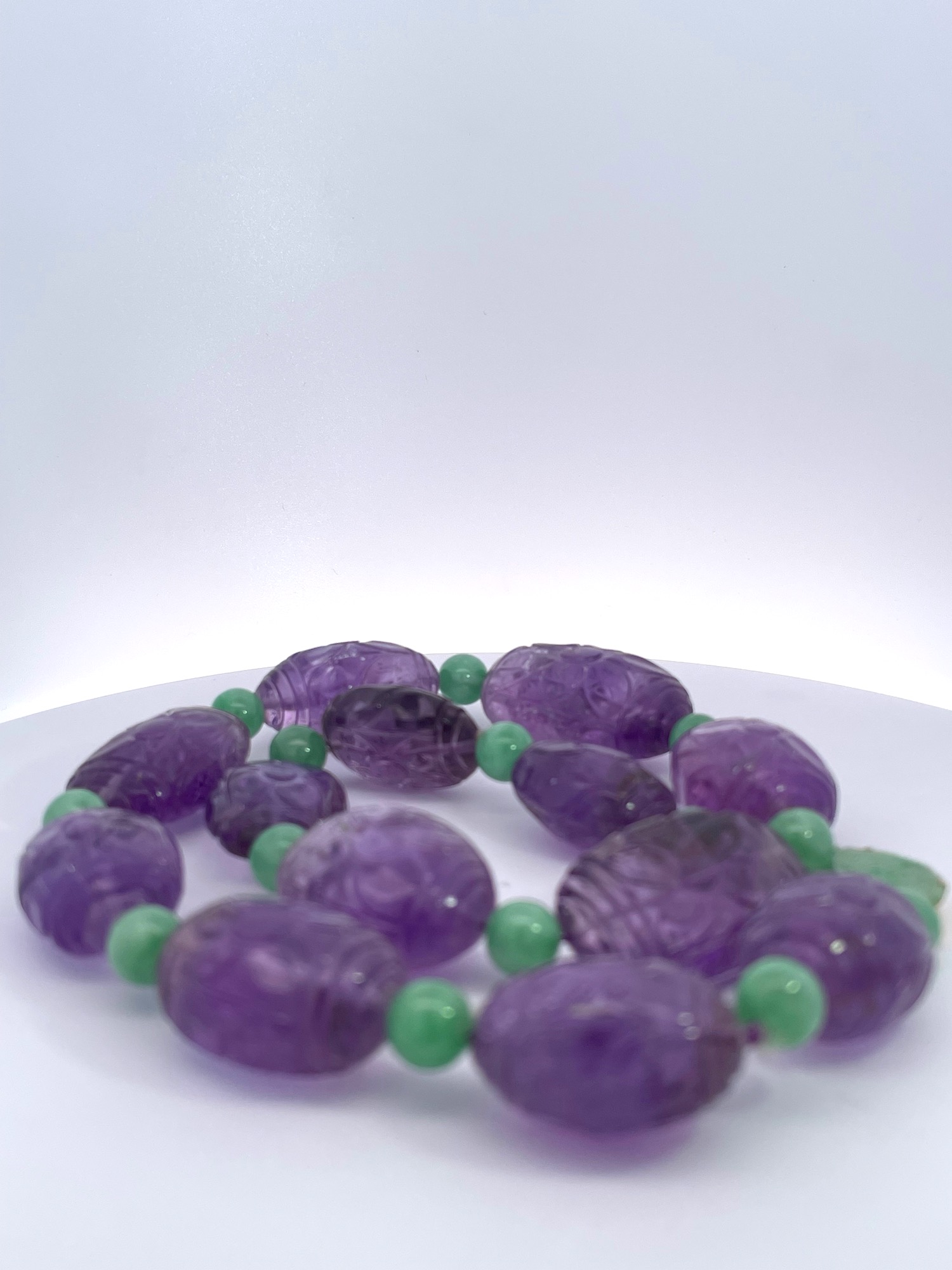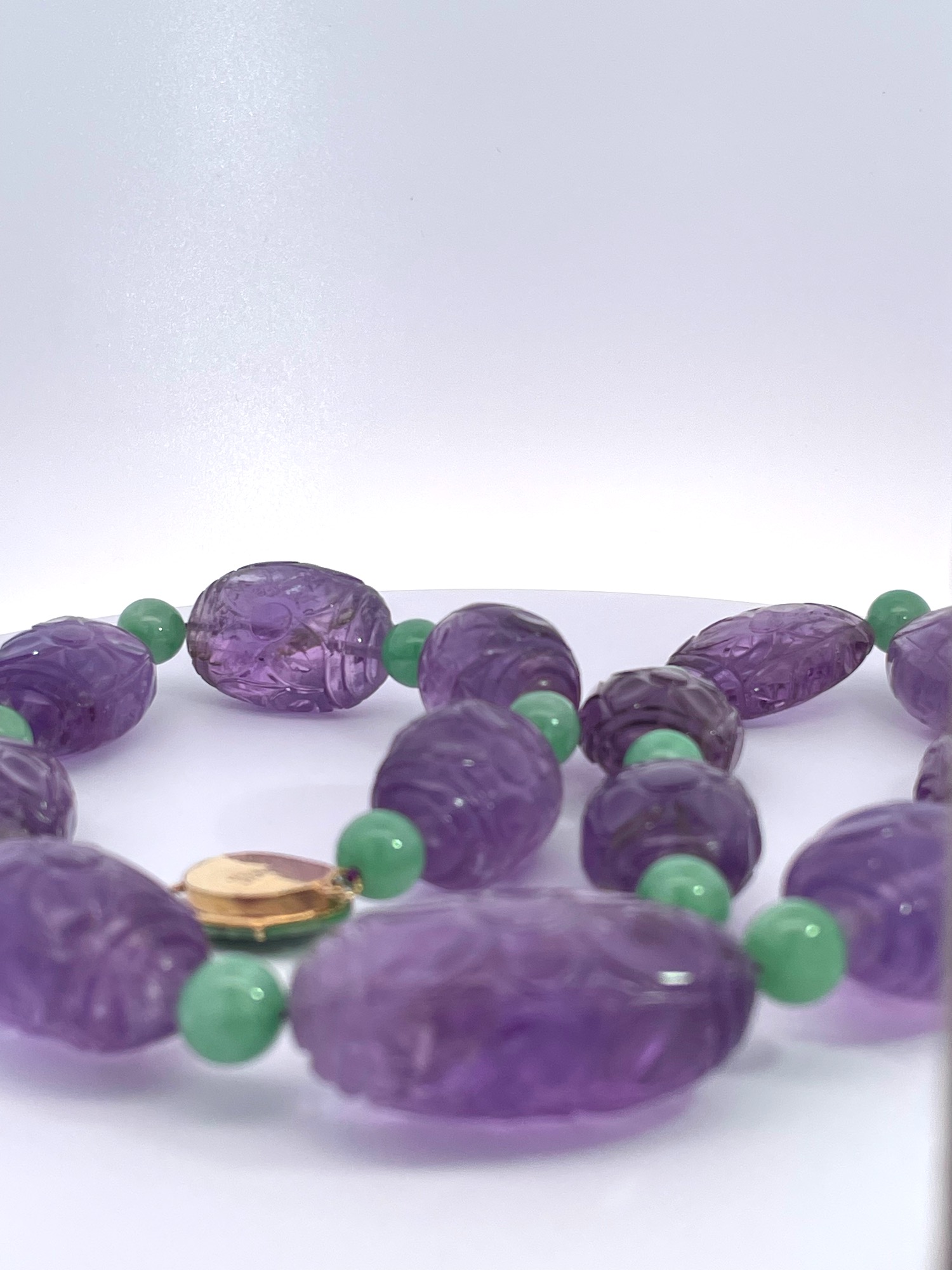 This lovely Amethyst Necklace has detailed carved Amethyst beads. The length is 19 1/2 " long and 3/4" wide. This necklace alternates between Carved Amethyst beads and simple round Jade beads. The closure is Jade with carved double bats. This necklace weighs in at 138.7 grams. I love this as the Amethyst beads almost glow as they move when you move. The details in the beads are special. The color way is exceptional, Amethyst and green Jade wow. I personally love this piece and hope you do too. This is priced to sell so do not wait.