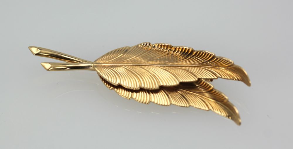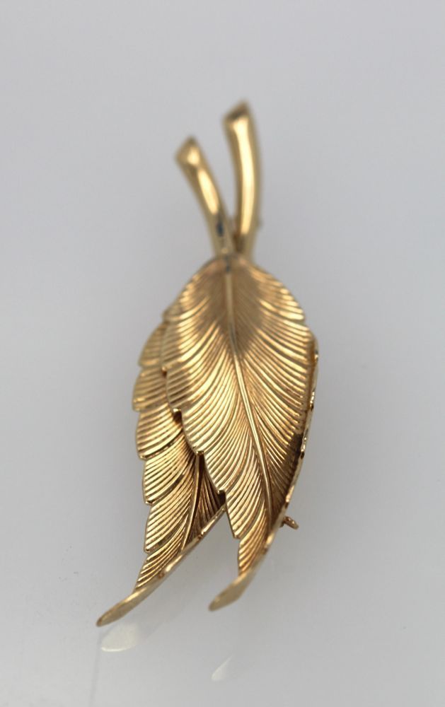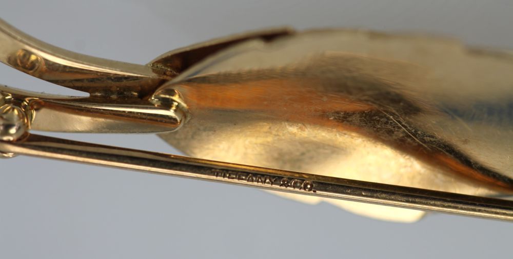 Vintage Tiffany Double Leaf Brooch. This vintage Tiffany double-leaf brooch is circa 1980 and is 14k gold. Highly detailed, it has a curve in the leaf making it even more realistic than at first glance. It can be worn either on a long chain as a pendant or as a pin; your choice.